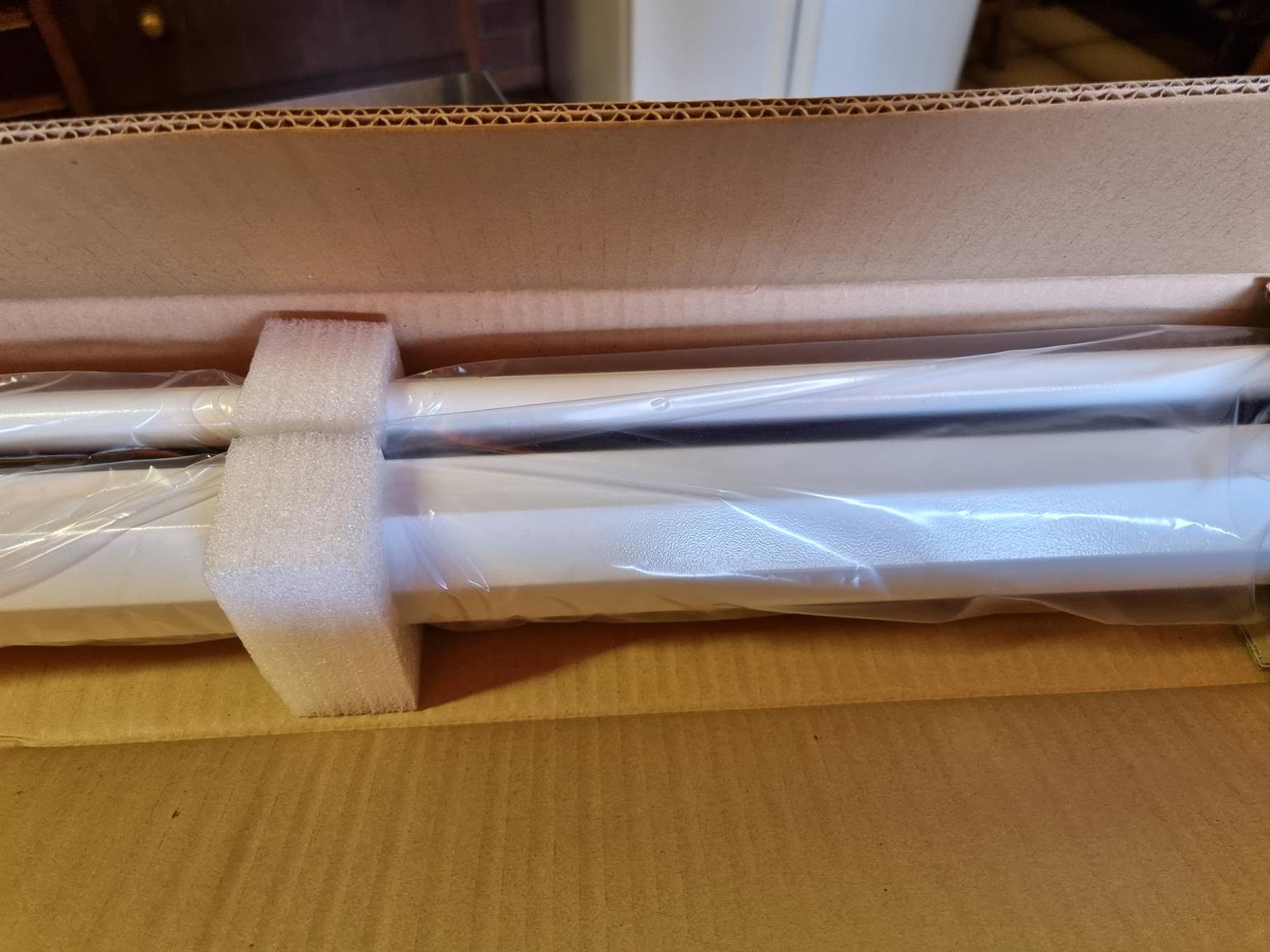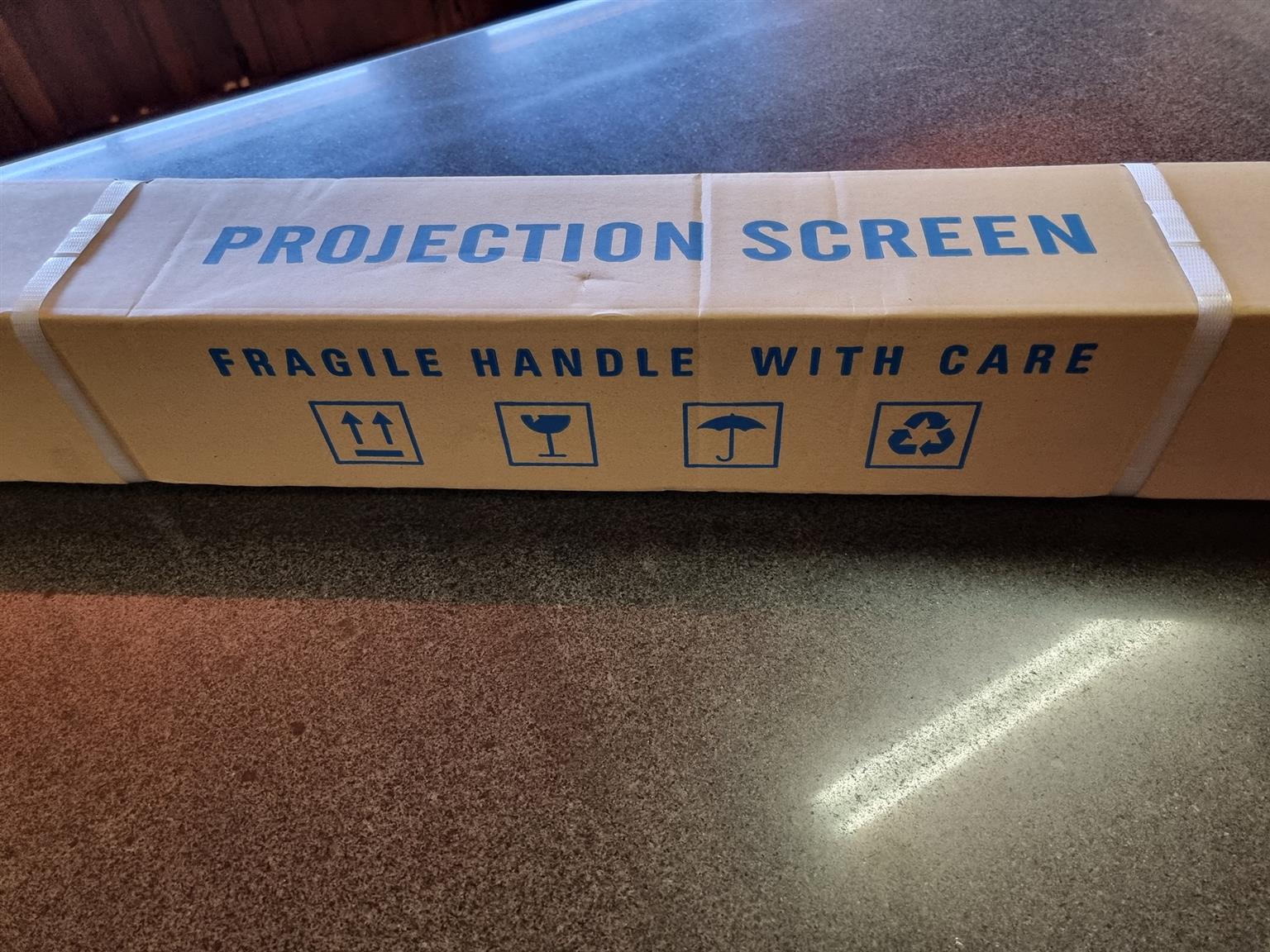 Wall mounted projection screen. Manual with white powder coated steel cabinet and good quality mat-white fabric. Size 72" (4:3)