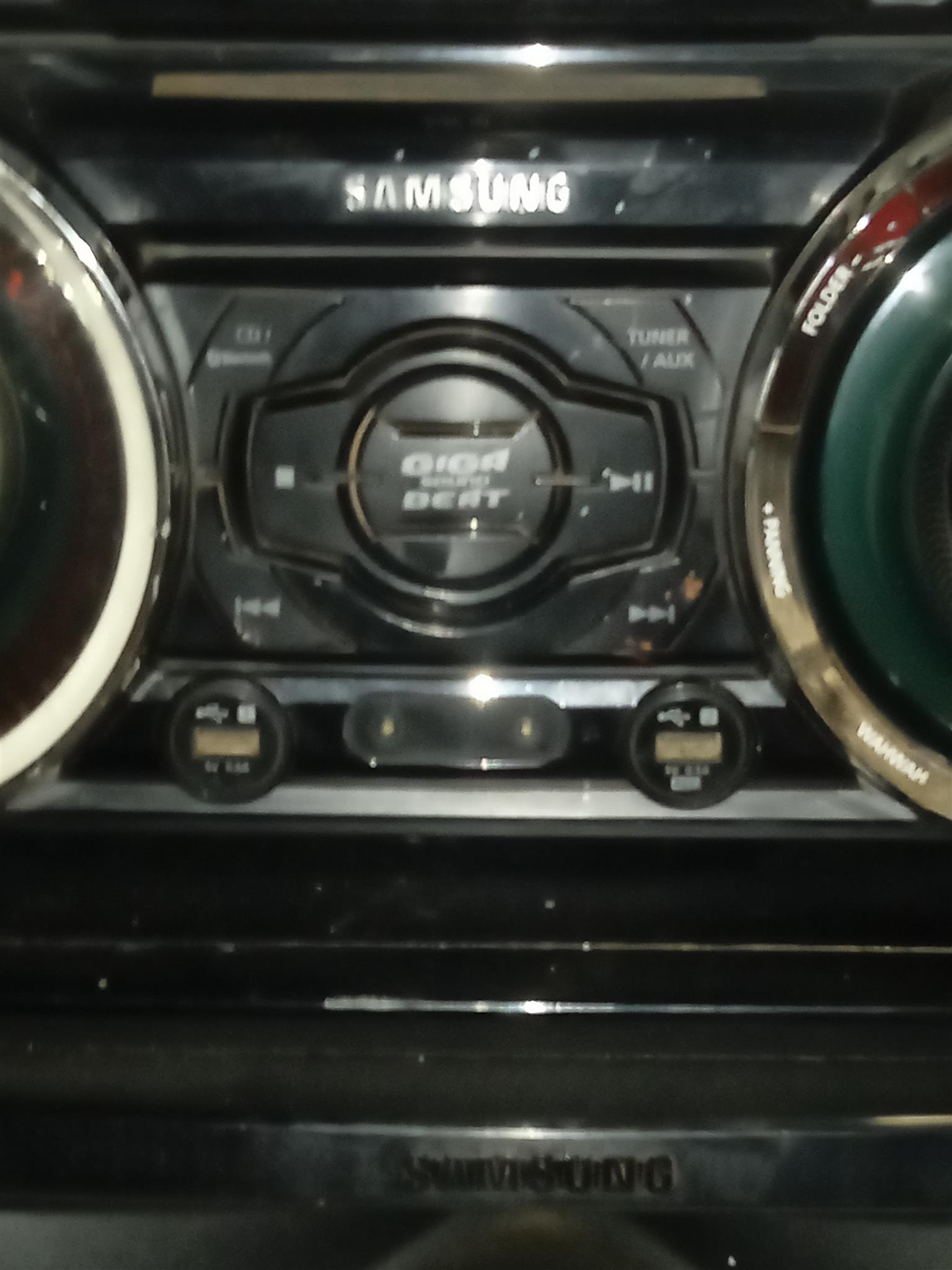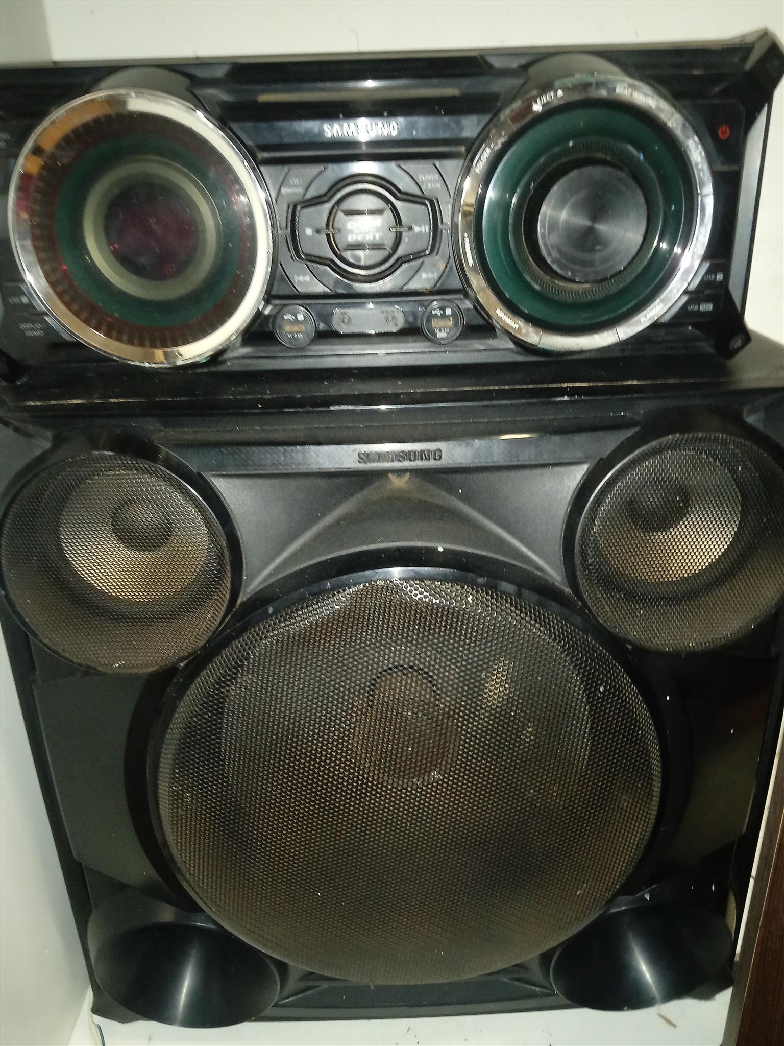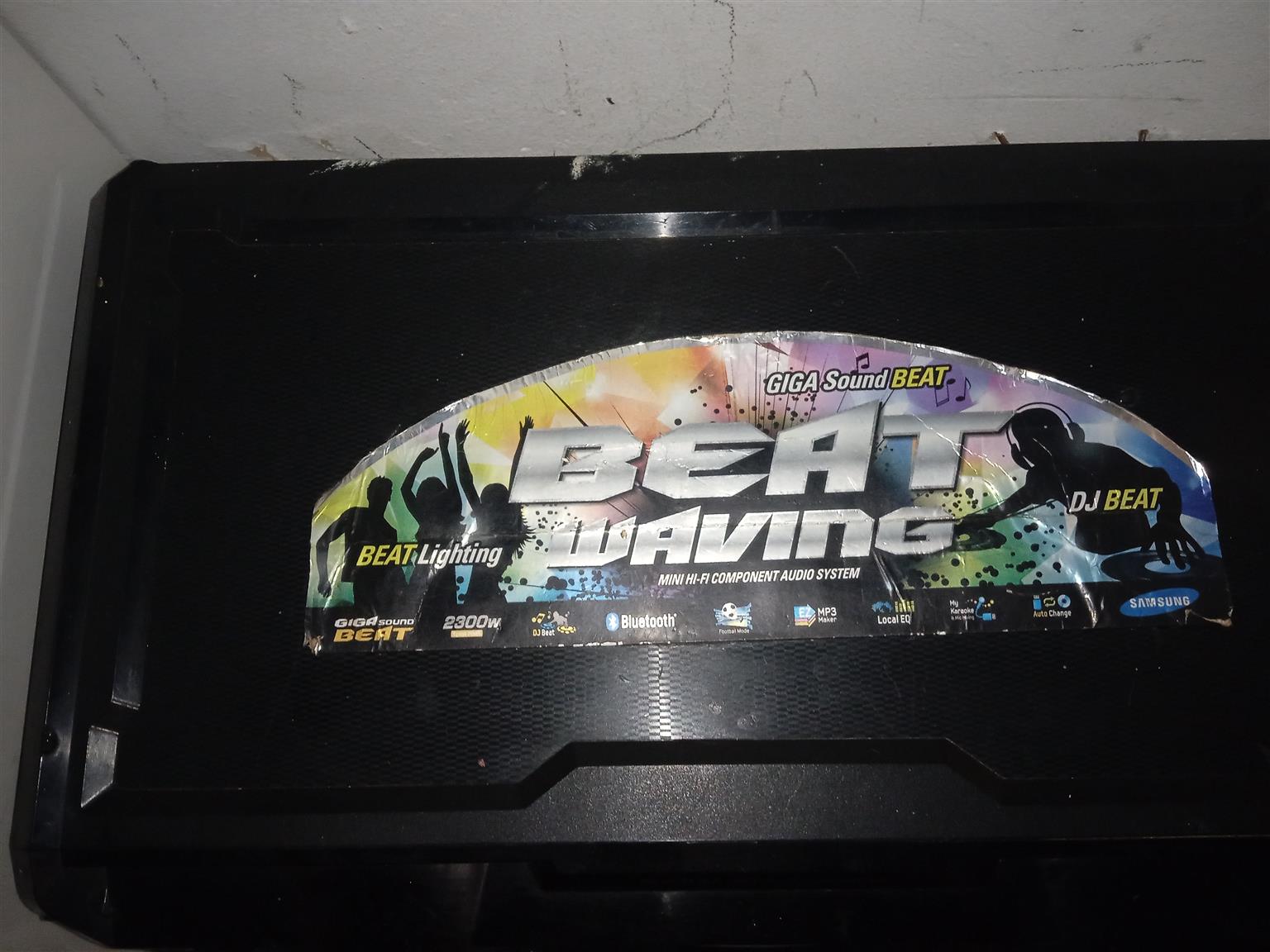 This is a 2300w sound system with giga sound ,DJ beat,Bluetooth football mode MP3 maker local EQ Karaoke,.But cd player doesn't work and only ha th One Speaker..Still playes very nice
