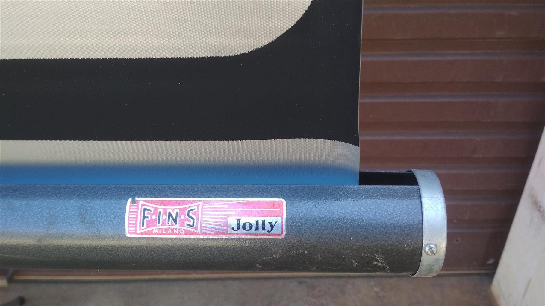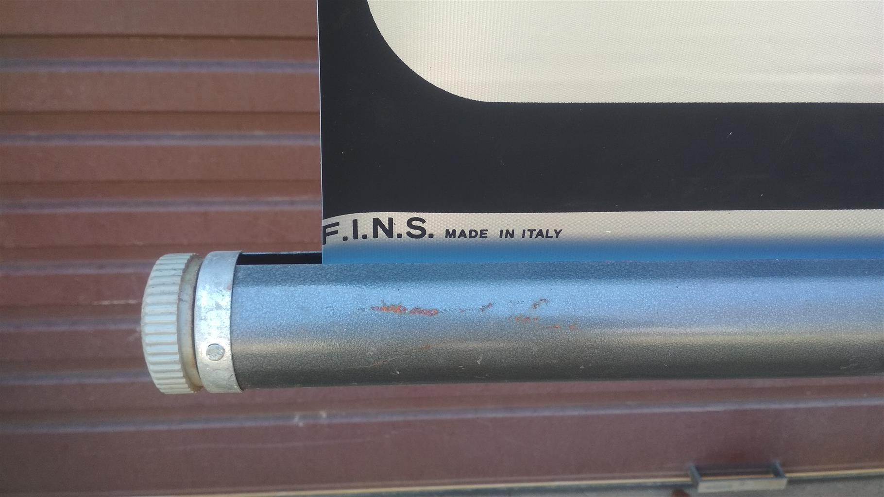 Screen, tripod projector type, 4:3 ratio, width 130cm. Make: FINS Milano Italy, working, good condition. Adjustable height, fine tuner for adjustable height.