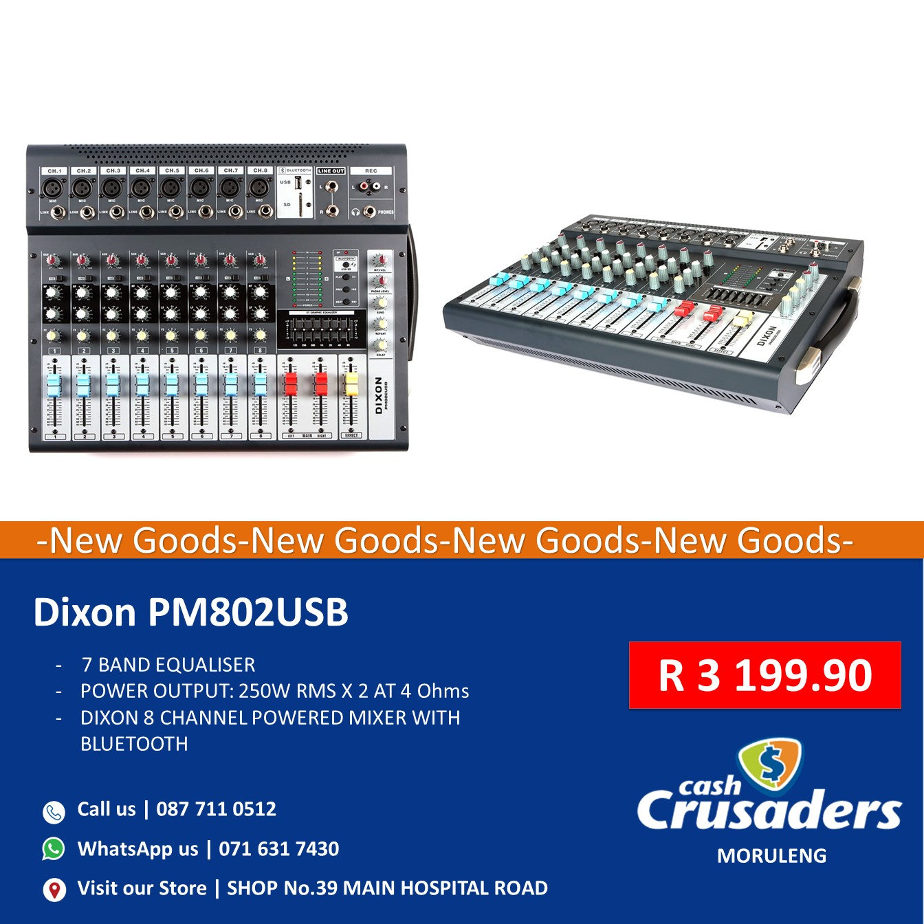 - 7 BAND EQUALISER- POWER OUTPUT: 250W RMS X 2 AT 4 Ohms - DIXON 8 CHANNEL POWERED MIXER WITH BLUETOOTH