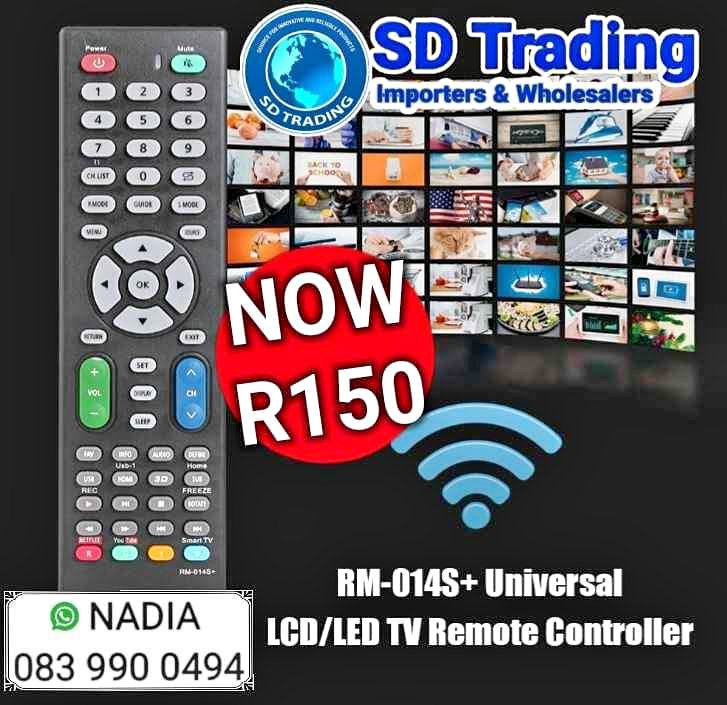Universal LCD/LED TV Remote Control RM-014S+ ‼️GRAB IT SALE‼️ R150👈NOW‼️ ‼️GRAB IT SALE‼️ Description: * Remote control can be used anywhere in the room, and can be remotely controlled. * Comfortable buttons, one-button operation, simple and convenient. * Beautiful appearance, fast response and accurate control. * Compatible with all current famous brand TVs, some TVs of a less known and inferior brand may not be supported. Specification: Model: RM-014S+ Colour: Black Material: ABS Battery: 2 X AAA Batteries (NOT Included) Transmission Distance: 8m/2.25ft Product Size: 210 X 52 X 20mm/8.27 X 2.05 X 0.79" COLLECTION AT OUR SHOP Shop 1, Pioneer Street Corner Northumberland Road, Opposite TAKEALOT PICKUP BELLVILLE CAPE TOWN GOOGLE MAPS 👇👇👇👇 SD Trading / SD Tactical-Security Google Maps 👇👇👇👇 https://maps.app.goo.gl/KAMd5qeav1qkrYJSA TRADING HOURS Monday to Friday: 8:30 - 17:00 Saturday: 9:00 - 14:00 Sunday: CLOSE PLEASE CONFIRM Public holidays Please Make Contact Via WhatsApp or Messenger💬 🌐WEB page for SA Online Shop - Go Dealz🌐 https://www.godealz.co.za/ ▶️Specials ⛔1000 ➕ Products to Choose From🔎 📞CONTACT SD TRADING Nadia 📲 083 990 0494view more GODEALZ https://www.facebook.com/profile.php?id=10008788876911view more6&mibextid=ZbWKwL SD TACTICAL and SECURITY https://www.facebook.com/profile.php?id=10007618840808view more5&mibextid=ZbWKwL