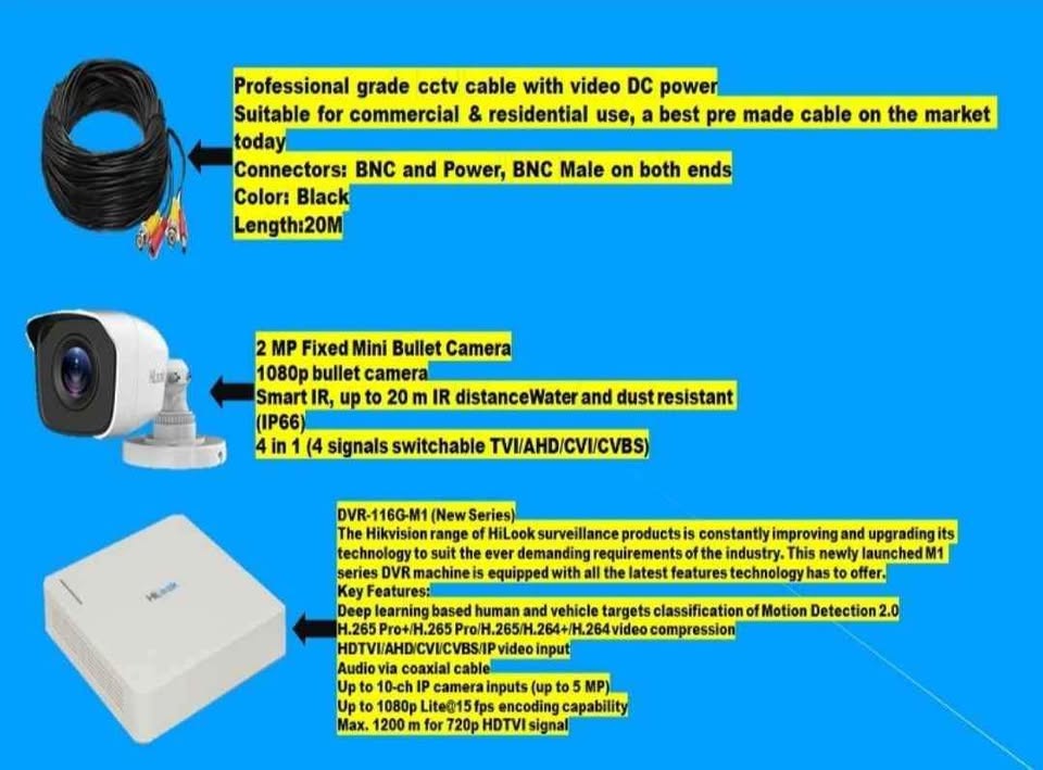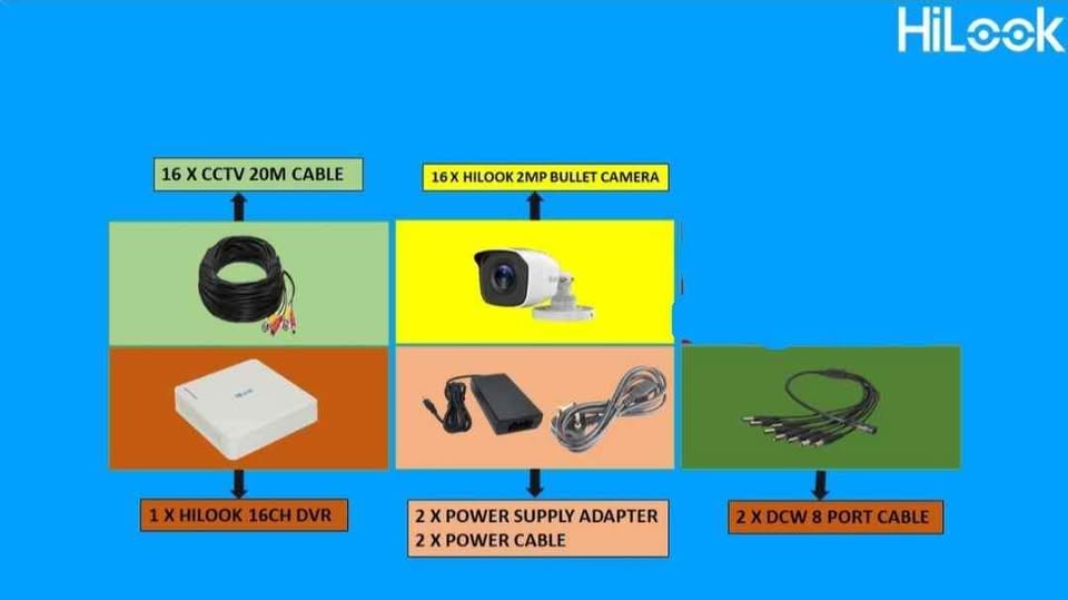 HiLook 16 Channel 1080p ColorVu Complete Kit HiLook is a brand manufactured by Hikvision who are world leaders in surveillance technologies. This system displays its powerful new ColorVu Technology. ColorVu Technology enables cameras to produce colorful videos even in extremely dimly lit environments. Darkness provides cover for theft, trespassing, and other crimes. When using a conventional camera with infrared lighting for night monitoring, people, vehicles, or other important objects are blurry and blend into the background, making it difficult to identify details. Color-related information is crucial for many scenarios and are a great asset for data and analyses. However, conventional cameras often lose important details when rendering only black and white images. ColorVu Technology is our solution to this common challenge faced by many security system users. Full Remote view capability via HiLook or Hik-Connect App What's in the box 1 x HiLook 16 Channel DVR (Model No. 216-F1) 16 x HiLook 2MP 1080P ColorVu Bullet Camera 2 x Hikvision 8CH Power Supply with Power Cable 16x 20m Pre-Built RG59 Cables 32 x BNC Connectors 16 x Power Jacks