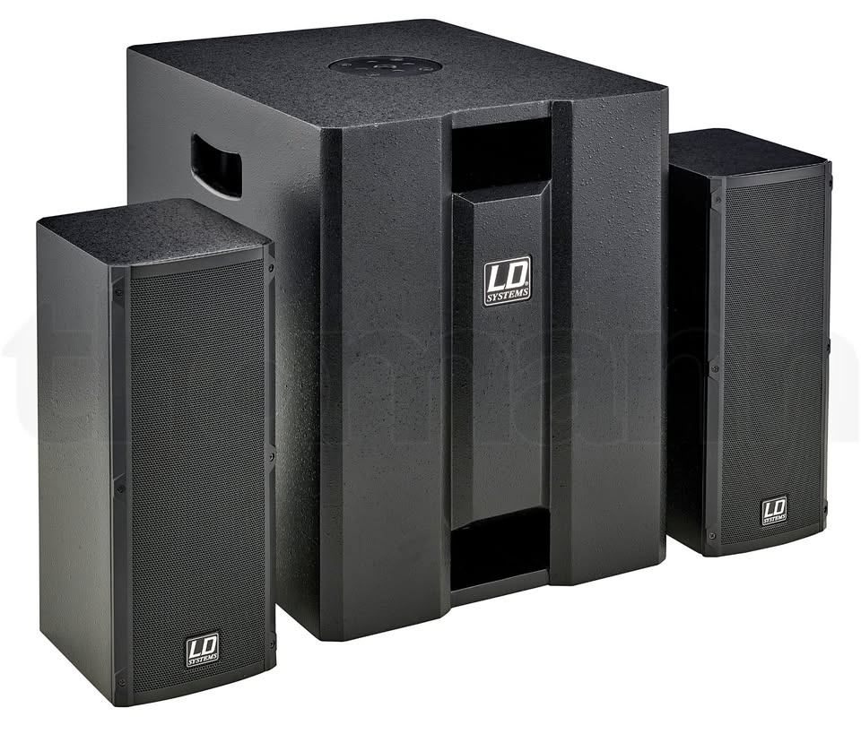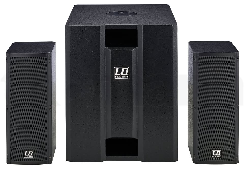 Compact PA/Media System Consists of an active bandpass subwoofer with 1x 8" speaker and two 2x 4" satellites with 1" d'Appolito drivers System power: 150 W sub (RMS) and 2x 100 W top (RMS) Frequency range: 45 - 19,000 Hz Maximum level: 117 dB Built-in limiter Integrated 3-channel mixer with XLR/Jack Mini stereo jack and RCA inputs Speaker Twist output 180° Phase reverse 16 mm Flange bushing Dimensions subwoofer: 352 x 430 x 434 mm Weight of subwoofer: 18 kg Satellite dimensions: 144 x 350 x 170 mm Weight satellites: 4.5 kg Colour: Black