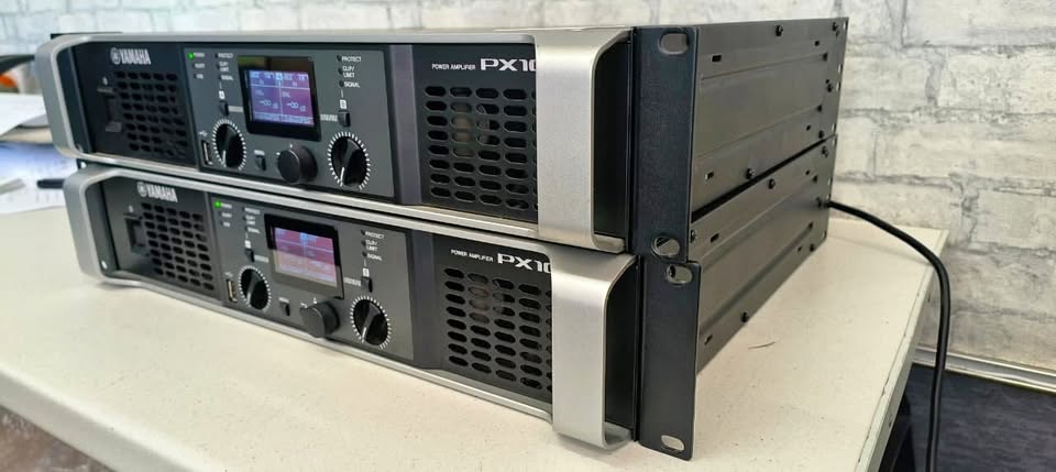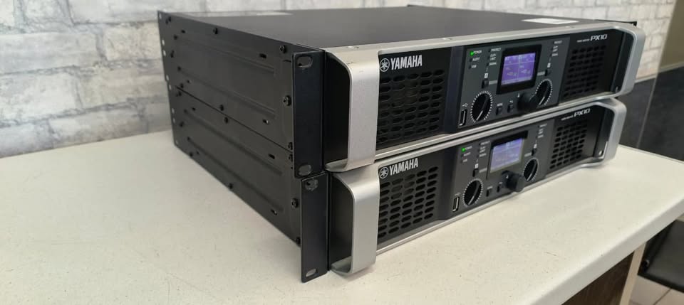 Yamaha PX10 Digital (Class-D) Stereo Power Amplifier – Specifications General Amplifier Type: Class-D, Balanced output circuit (BTL) with Yamaha custom LSI + PLL Channels: 2 (stereo) DSP Processing: 48 kHz sampling, 24-bit AD/DA converters, 128× oversampling Rack Size: 2U Power Output (both channels driven, 1 kHz, non-clip burst, 20 ms) 8 Ω: 1,000 W × 2 4 Ω: 1,200 W × 2 2 Ω: 700 W × 2 Audio Performance THD+N: 0.1% (1 kHz, 10 W), 0.3% (1 kHz, half power) Frequency Response: 20 Hz – 20 kHz (±1 dB, 1 W, 8 Ω) S/N Ratio: 101 dB (A-weighted, 8 Ω, Gain = +14 dBu) Crosstalk: < –60 dB (1 kHz, 8 Ω, half power) Latency: 1.5 ms (analog input to speaker output) Input & Output Inputs: 2 × XLR-3-31 (balanced) 2 × 1/4″ TRS jacks Input Impedance: 20 kΩ balanced / 10 kΩ unbalanced Max Input Level: +24 dBu Outputs: 2 × Neutrik speakON NL4 2 × Binding posts (pairs) 2 × 1/4″ TS jacks USB: Type-A (for presets, firmware, updates) Gain & Sensitivity (8 Ω) Gain = 32 dB → Sensitivity +9.3 dBu Gain = 26 dB → Sensitivity +15.3 dBu Gain = +4 dBu → Gain 37.3 dB Gain = +14 dBu → Gain 27.3 dB DSP & Processing Functions: D-CONTOUR dynamic EQ (FOH/MAIN, MONITOR, OFF) Input summing Delay: 0–74 ms HPF/LPF: 20 Hz – 20 kHz Polarity invert Speaker Processor: 6-band Parametric EQ, Limiter, Delay Presets: 8 user memories + Yamaha speaker presets Modes: Basic / Advanced setup, Config Wizard, Panel lock Protection Load protection, DC-fault shutdown, over-voltage limiter Thermal, over-current, over-voltage, power limiters (auto reset/mute) Indicators LEDs: POWER (green), ALERT (red), USB (green), PROTECT ×2 (red), CLIP/LIMIT ×2 (red), SIGNAL ×2 (green) Auto LED off function Power & Cooling Voltage Models: 100 V / 120 V / 220–240 V, 50/60 Hz Rated Power Stability: ±10% supply variation Consumption: 310 W (1/8 power, 4 Ω, pink noise, both ch.), ~60 W idle Cooling: Dual variable-speed fans (16-step), front-to-rear airflow Dimensions & Weight Size (W×H×D): 480 × 88 × 388 mm (18.9 × 3.5 × 15.25 in) Weight: 7.4 kg (16.3 lb) Environmental Operating Temp: 0 °C – +40 °C Storage Temp: –20 °C – +60 °C