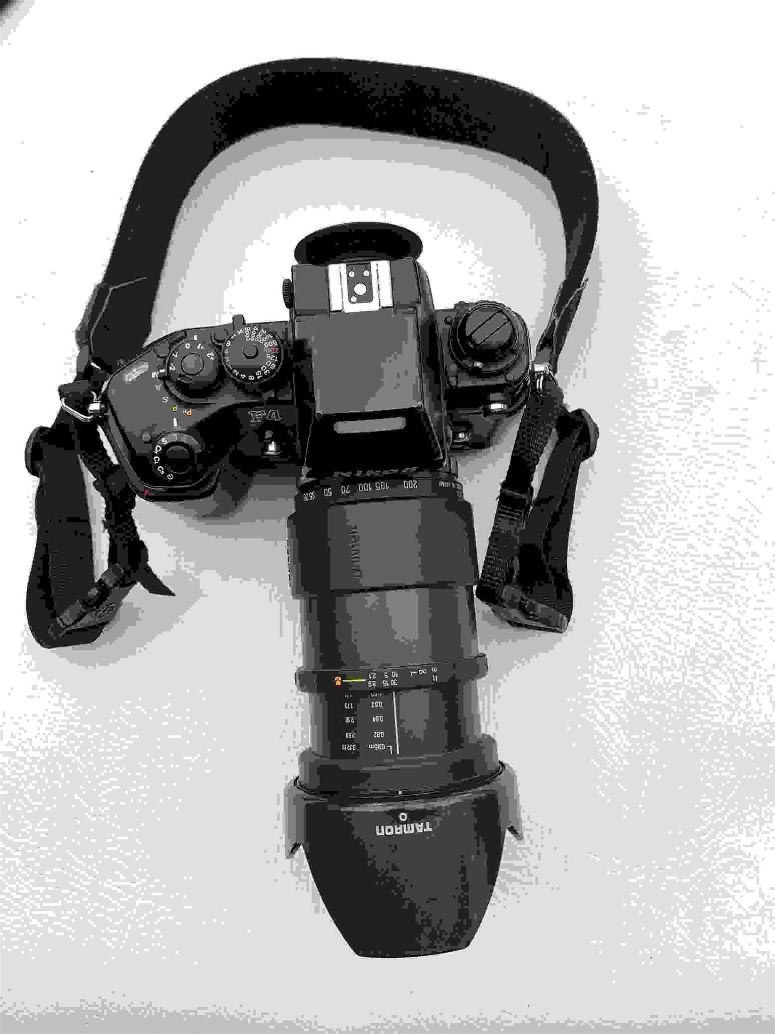 Nikon F4 with Tamron AF Aspherical LD 28-200mm f3.8-5.6 zoom lens. A tough camera with fast autofocusing. The kit includes a Tamrac neoprene camera strap, body cap, Hoya UV(O) 72mm filter, lens hood, front and rear lens caps. The body is in excellent condition with only some minor scuff marks and the lens is clean.