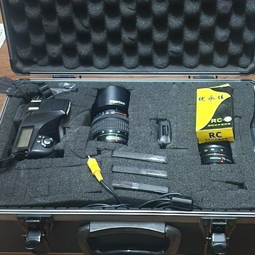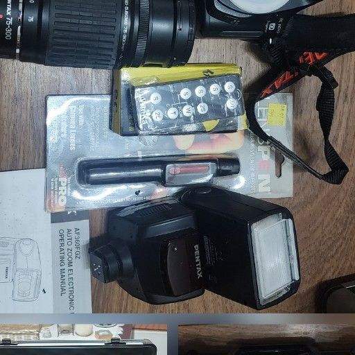 Pentax K100d Super SLR Digital Camera. Comes with Pentax 18-55 and Pentax 75-300mm lens, Pentax Auto zoom electronic flash, remote control, a professional lens cleaner, 3 x Conik filters. Has a hard secure carry case. Valued over 12,000.