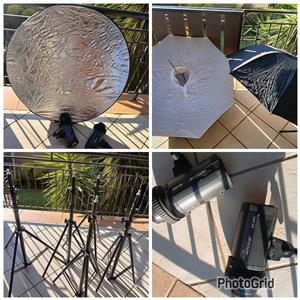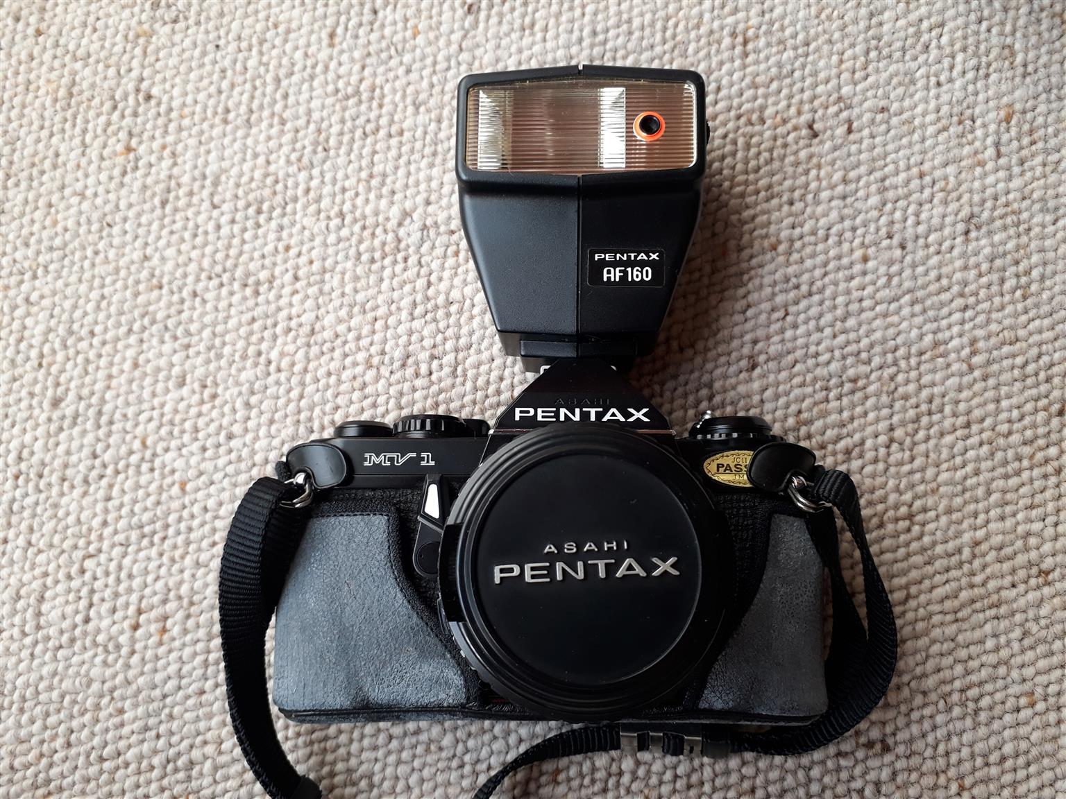 Pentax Asahi camera with a flash and leather carry case.