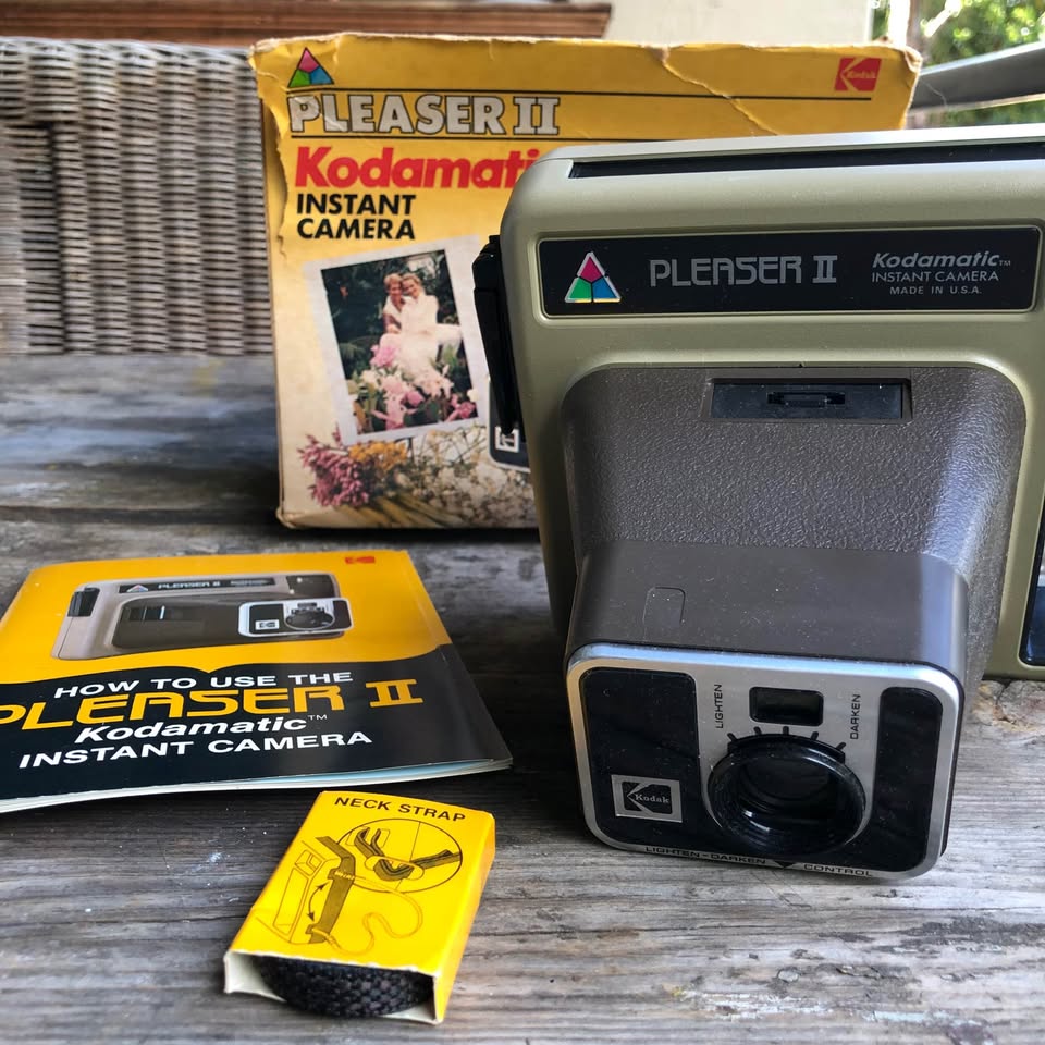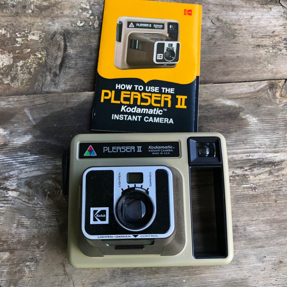 Travel back in time with the vintage Kodak Pleaser II instant camera from the early 1980s. A classic piece from Kodak's Kodamatic Pleaser series, it offers the simplicity of a point-and-shoot design reminiscent of the Polaroid instant cameras of its era. However, it's important to note that currently, there's no available film compatible with Kodak instant cameras. Although it has a film cartridge inside, there are no guarantees that it is still in printable condition. Therefore, any remaining stock has become obsolete, making this camera more of a nostalgic collectible than a functional device.