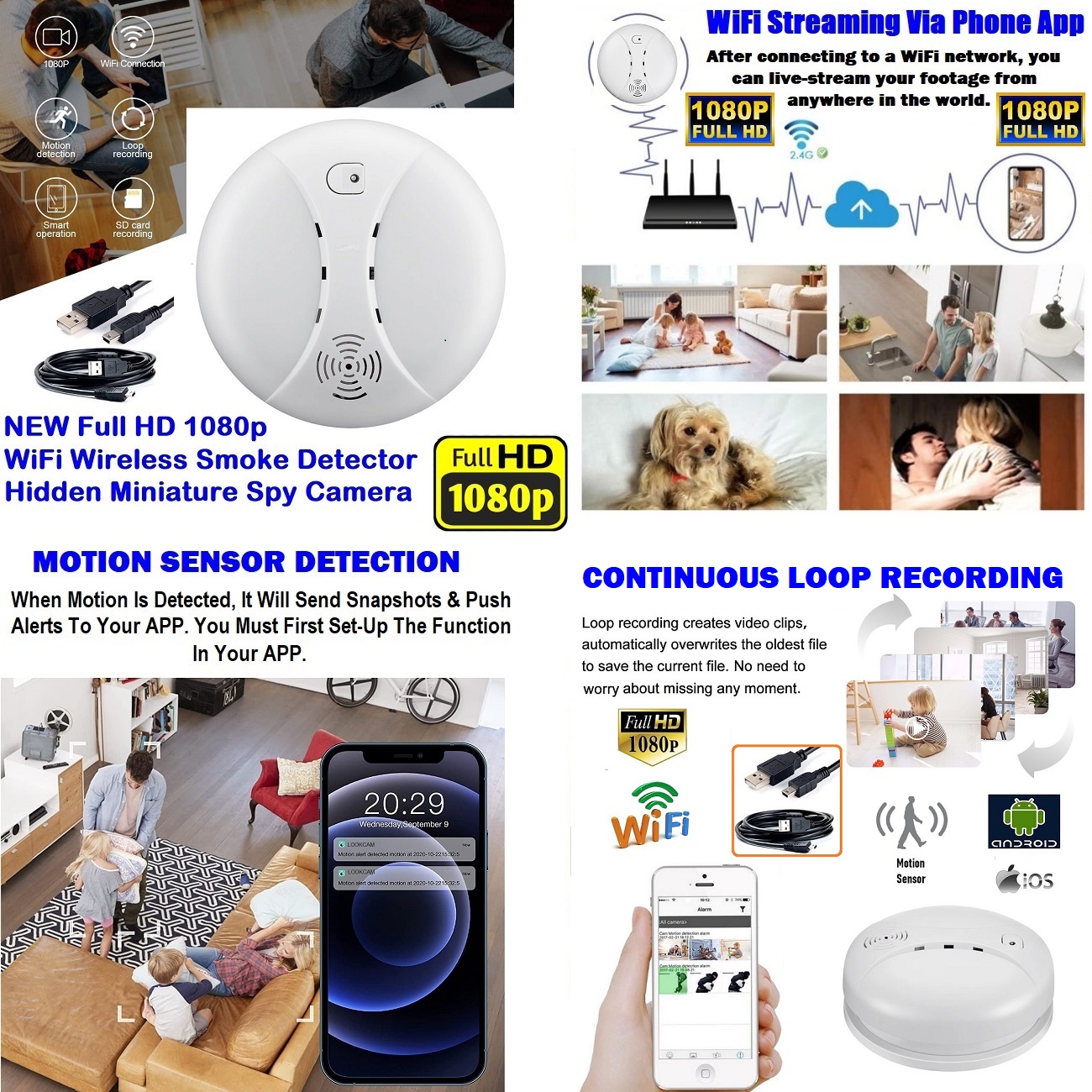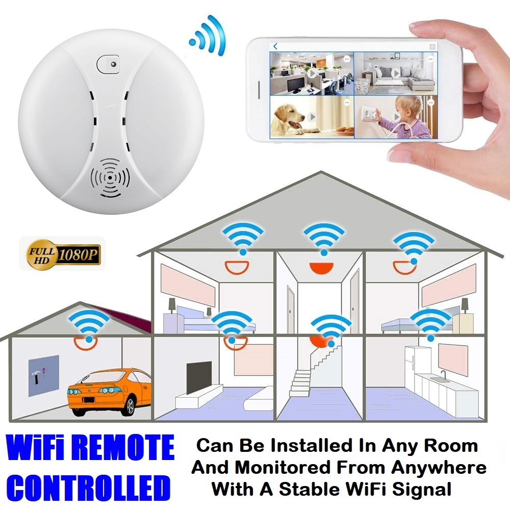Latest New Full HD 1080p WiFi Wireless Smoke Detector Hidden Miniature Spy Camera Security Camera With Motion Detection And Recording Capability. (Disguised As A Smoke Detector With Motion Detection Activation Plus Mini Video Recording, Photos And Audio/Sound).