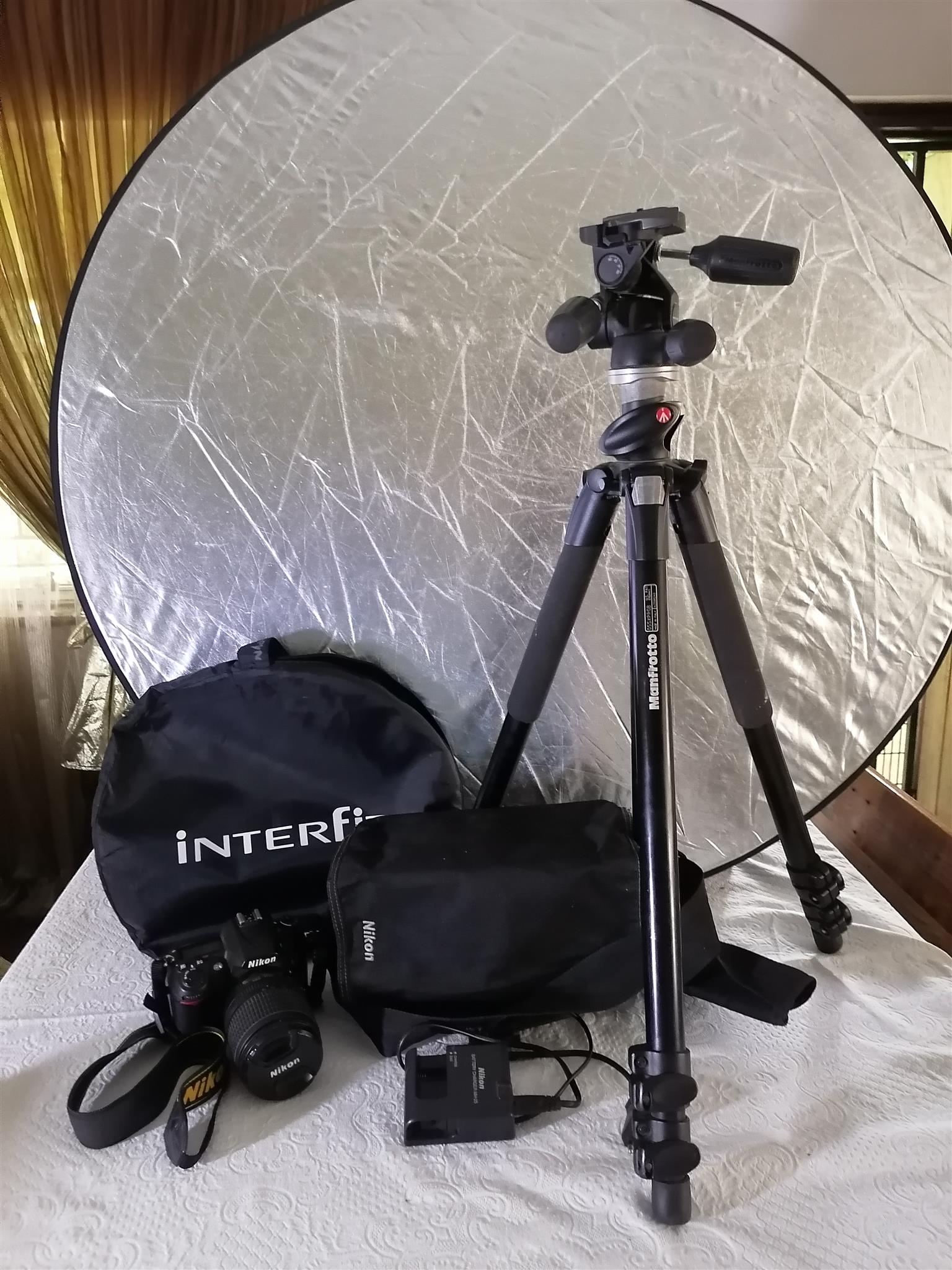 - Nikon D7000 with nikon AF-S NIKKOR 18-105MM lens- Nikon bag- Manfrotto tripod (legs 055XPROB and head 804RC2)- Interfit 5-in-1 reflector