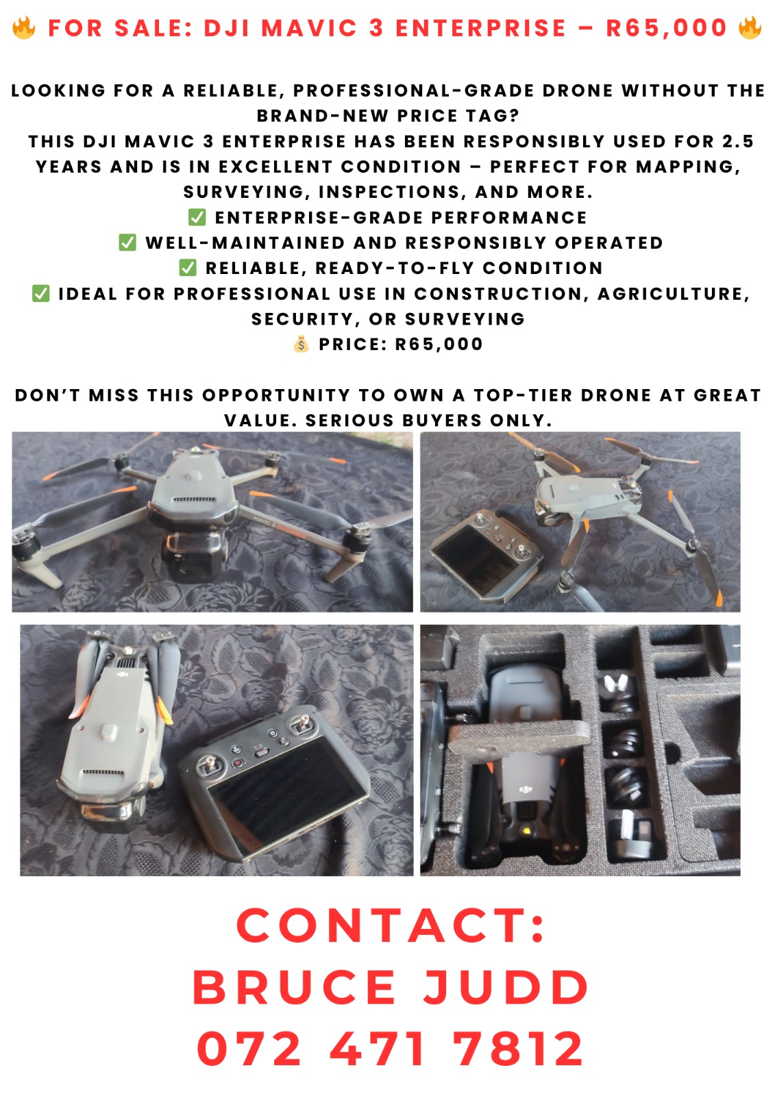 Mavic 3 Enterprise Drone in excellent condition as new. 1 Additional smart battery valued at R5k included. Ideal for surveying, security, aerial photography and so much more.
