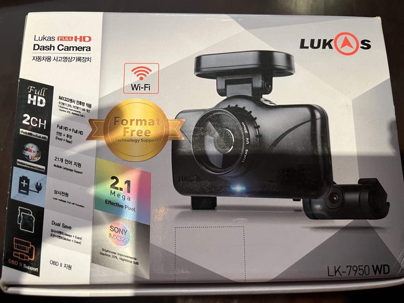2 channel- front and rear, Wi-Fi, GPS, format free technology, multiple language support, 2.1 mega effective pixel, dual save, low voltage cutoff function, OBD II support