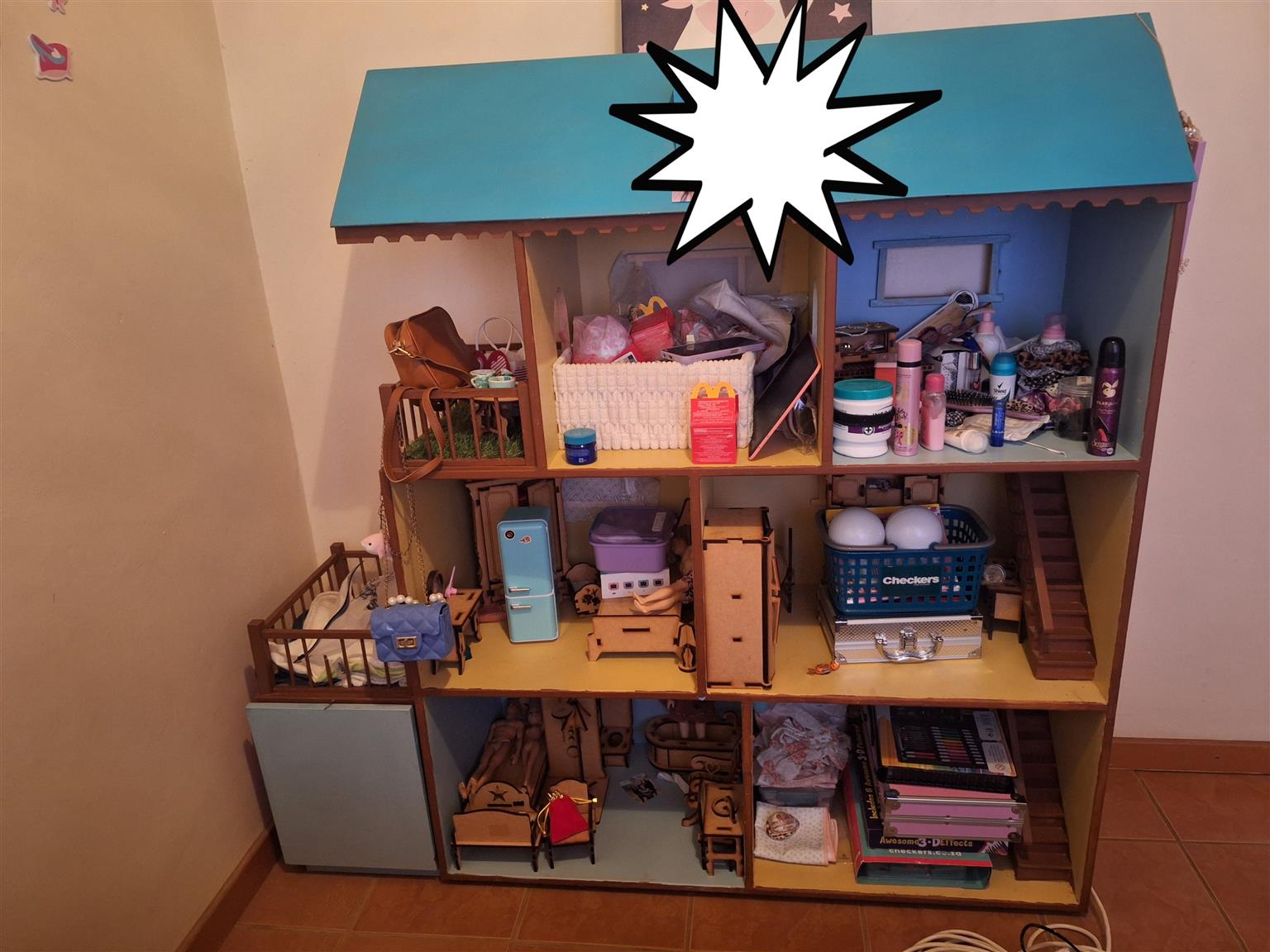 Groot pophuis met hout meubels te koop. 135cm x 130cm x 40cm (sluit nie alle items op foto in nie)