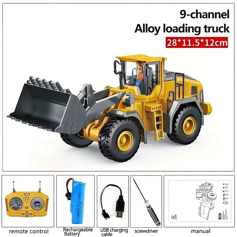 9 Channel remote control 2.4 Ghz Turn left Turn right Forward Backward Load Rise Sound Light One-click demo Loading function Rise function Multi-directional remote control Sound function Front headlight One-click demo Loading function Rise function Multi-directional remote control Sound function Front headlight One-click dem Configuration: Channels: 9 channels Battery type: 3.7V 500mAh Charger: USB Charging time: about 120 minutes Use time: about 40 minutes Remote control: 2.4G Remote control batteries: 2 X 1.5V AA batteries (not included) Actual size: 13.5cm X 25cm X 12cm