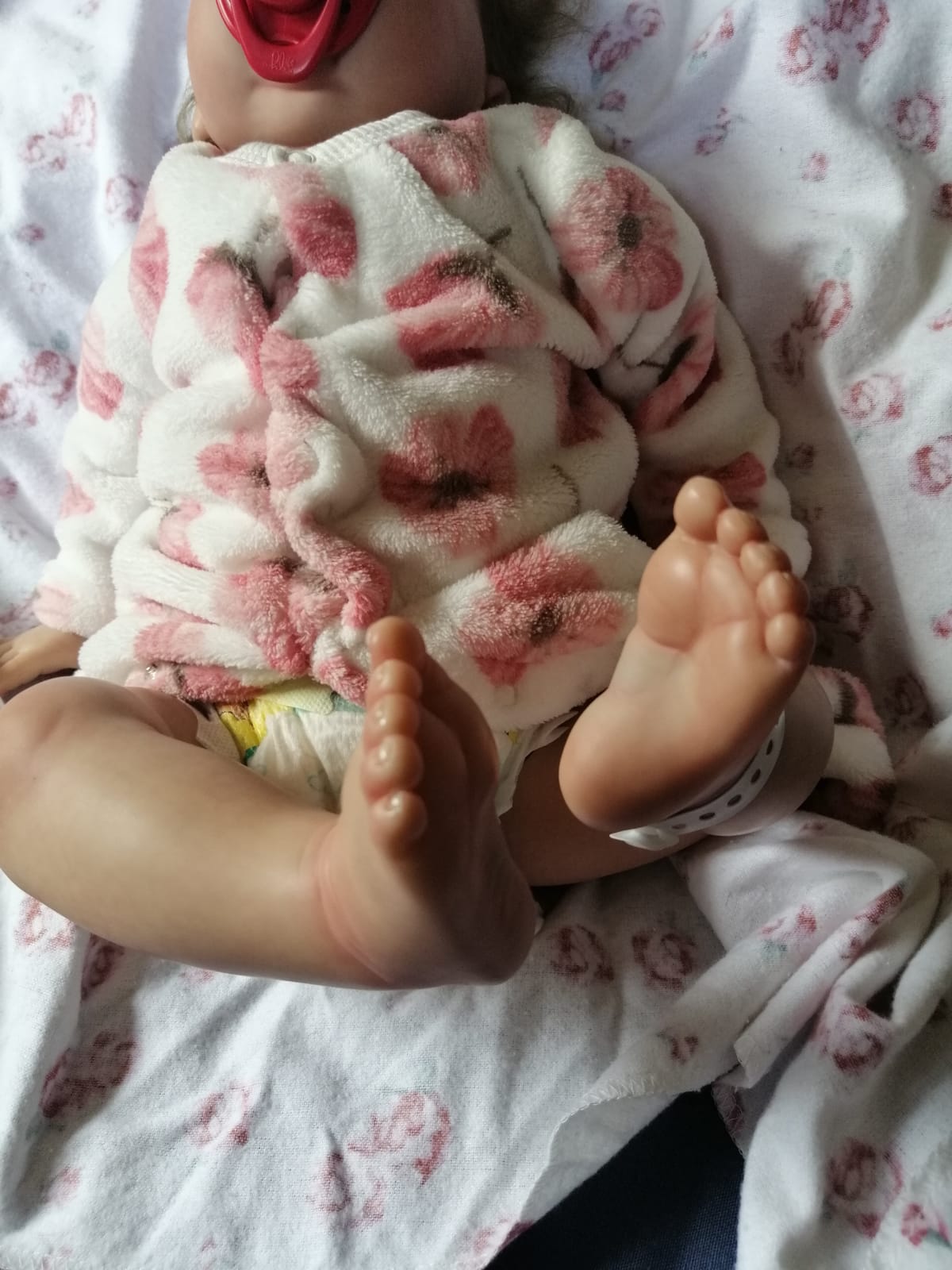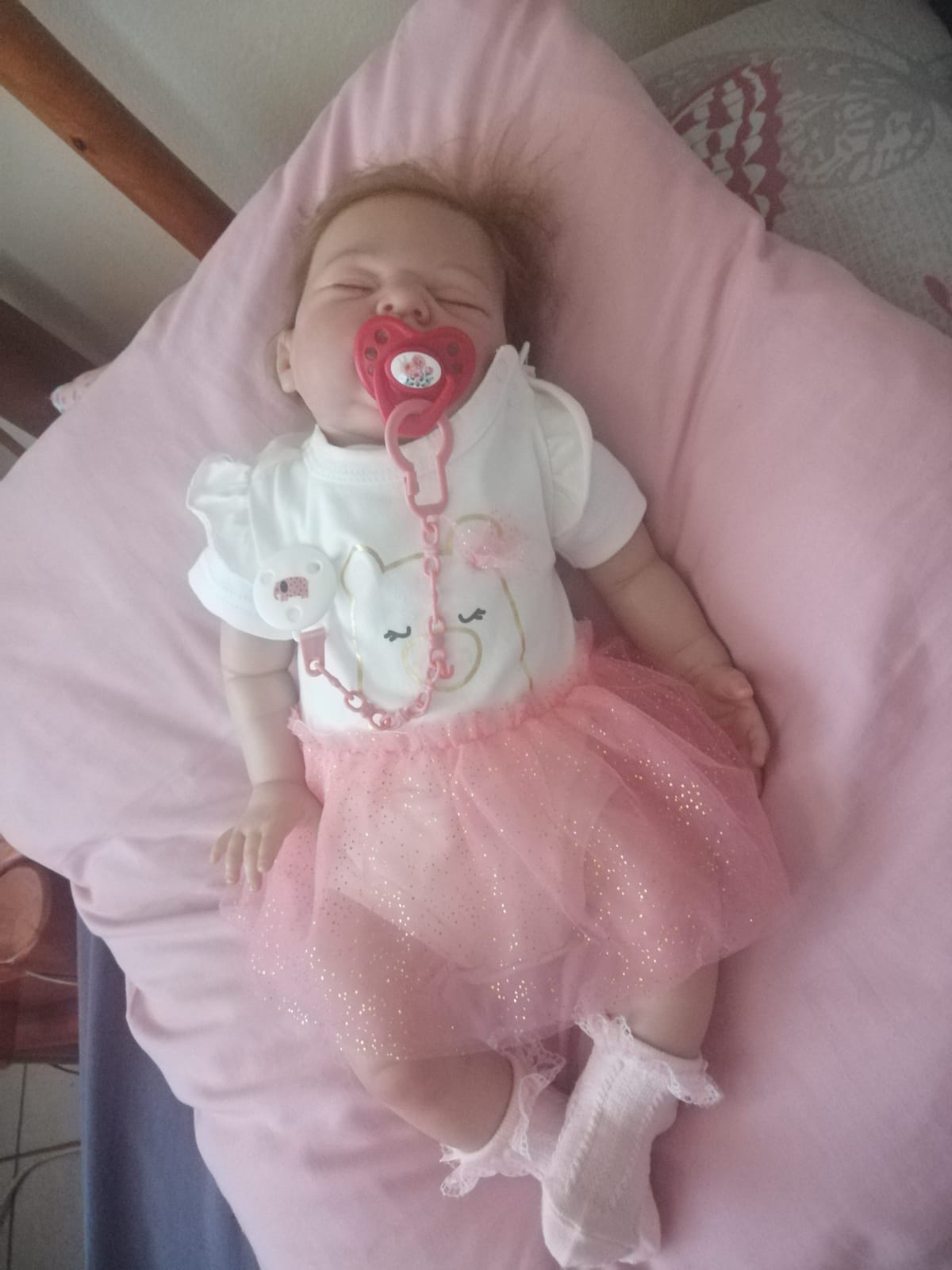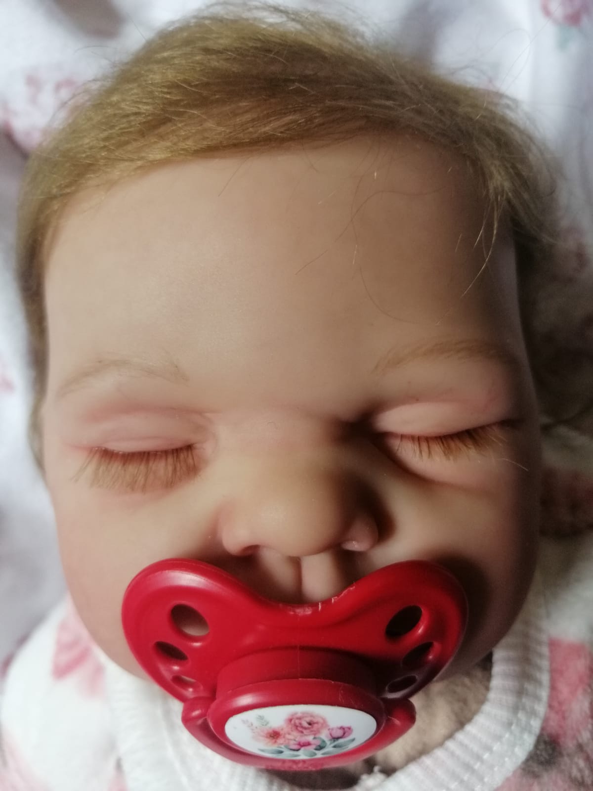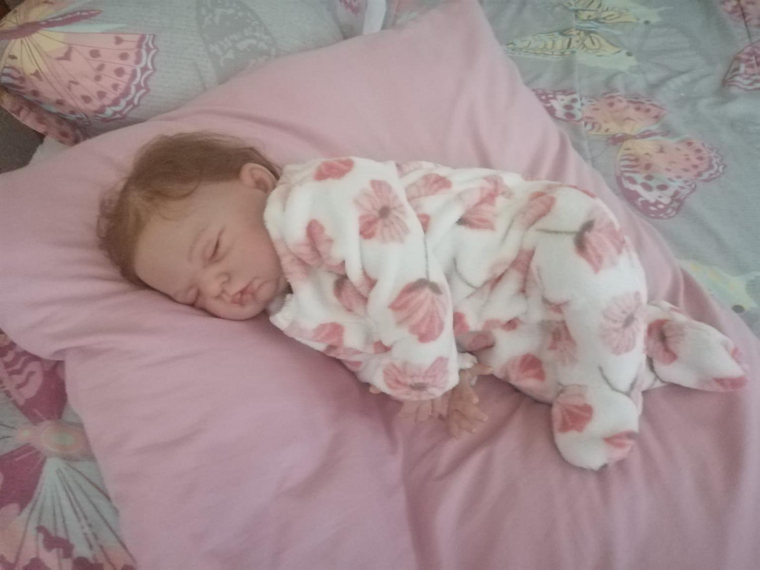 Beautiful reborn baby, het name is Sugar. She is 50cm long, weighs 2kg. She has closed eyes and light brown hair. She is a vinyl reborn with a cloth body. She is so adorable and nice to cuddle. She comes with a magnet dumme and nappy and outfit, which msy be different from the photo. She is up for adoption and waiting for her forever home.