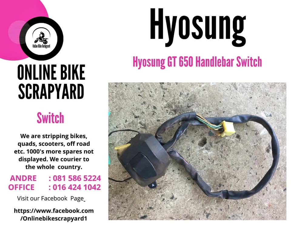 Hyosung GT 650 handle bar switch. Meyerton bike Scrapyard new and secondhand spares and accessories and workshop. We stripping bikes,quads, scooters, off roads etc. We courier country wide. Address 26 Karney str c/o Jim Fouche str Nelsonia Meyerton Andre call or WhatsApp or Landline