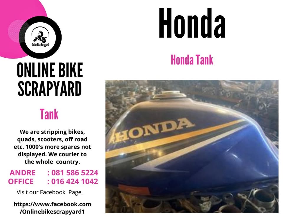 Honda tank. Meyerton bike Scrapyard new and secondhand spares and accessories and workshop. We stripping bikes, quads, scooters, off roads etc. We courier country wide. Address 26 Karney str c/o Jim Fouche str Nelsonia Meyerton Andre call or WhatsApp or Landline