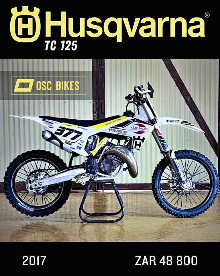 Make: Husqvarna Display name: TC 125 Year: 2017 Displacement (cc): 124.8 Engine stroke: 2 stroke Transmission type: Manual Starter: Kick Carburetor: Yes Hours: Complete motor rebuild Price: R48, 800 Finance available: No OSC Bikes 182 Graham Road, Shere, Pretoria East Tiaan - Elsje -