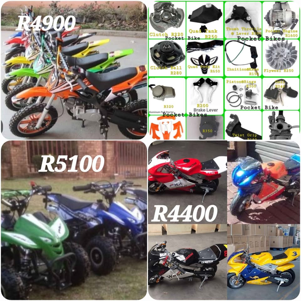 New petrol and 2 stroke pocket quads for small kid's from 3/4 up to 6/7 of age. Can set the speed limit and also have safety switch.We do keep all parts on our quads.For more information please contact or whats us on .Thanks Promoto