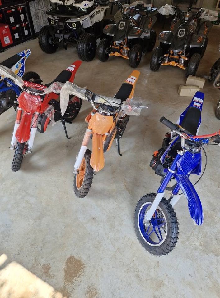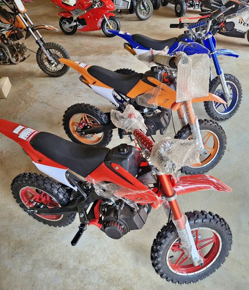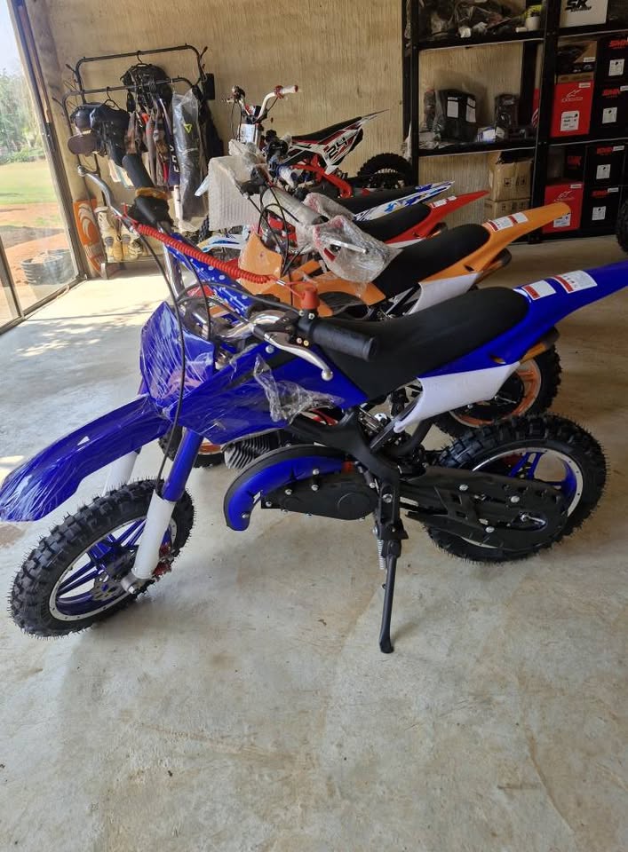 50cc 2 Stroke Air Cooled 3HP Mini Dirt Bike R 5899 each 50cc 2 Stroke Economic Air-cooled Petrol Driven Dirt Bike consisting of front and rear disc brakes, adjustable rear shock, under seat exhaust, safety ignition key, safety kill switch. Bike can carry a weight of 60 kg and reach 55-60 km/h. Bikes come with FREE Spiderman Helmet basic toolkit, manual and fuel mixture bottle + Factory sticker kit. The ratio is 25:1 unleaded fuel pre-mixed with 2 Stroke Motorcycle oil Mini Dirt Bike Specifications: Engine: 50cc 2 Stroke Air-cooled Petrol Driven Single Cylinder Displacement: 44ml Compression Ratio: 7.5:1 Max Power: (Kw/r/min): 2/7500 Max Torque: (N.m/r/min): 2.3/3600 Transmission: Chain Driven with Full Automatic Centrifugal Clutch System Starting System: Manual Pull-start Method Only Ignition: CDI Wheel: Alloy Wheel Rims Tyres: Front = 2.50-10, Rear = 2.50-10 Fuel Tank: 2L Max Speed: 55 km/h Max Weight: 70 Kg Brake System: Front and Rear Disc Brakes Diamensions: (Length X Width X Height): 107X30X54cm Gross Weight: 26Kg Wheelbase: 860mm Seat Height: 560mm Ground Clearance: 180mm Zwavelpoort, Pretoria East