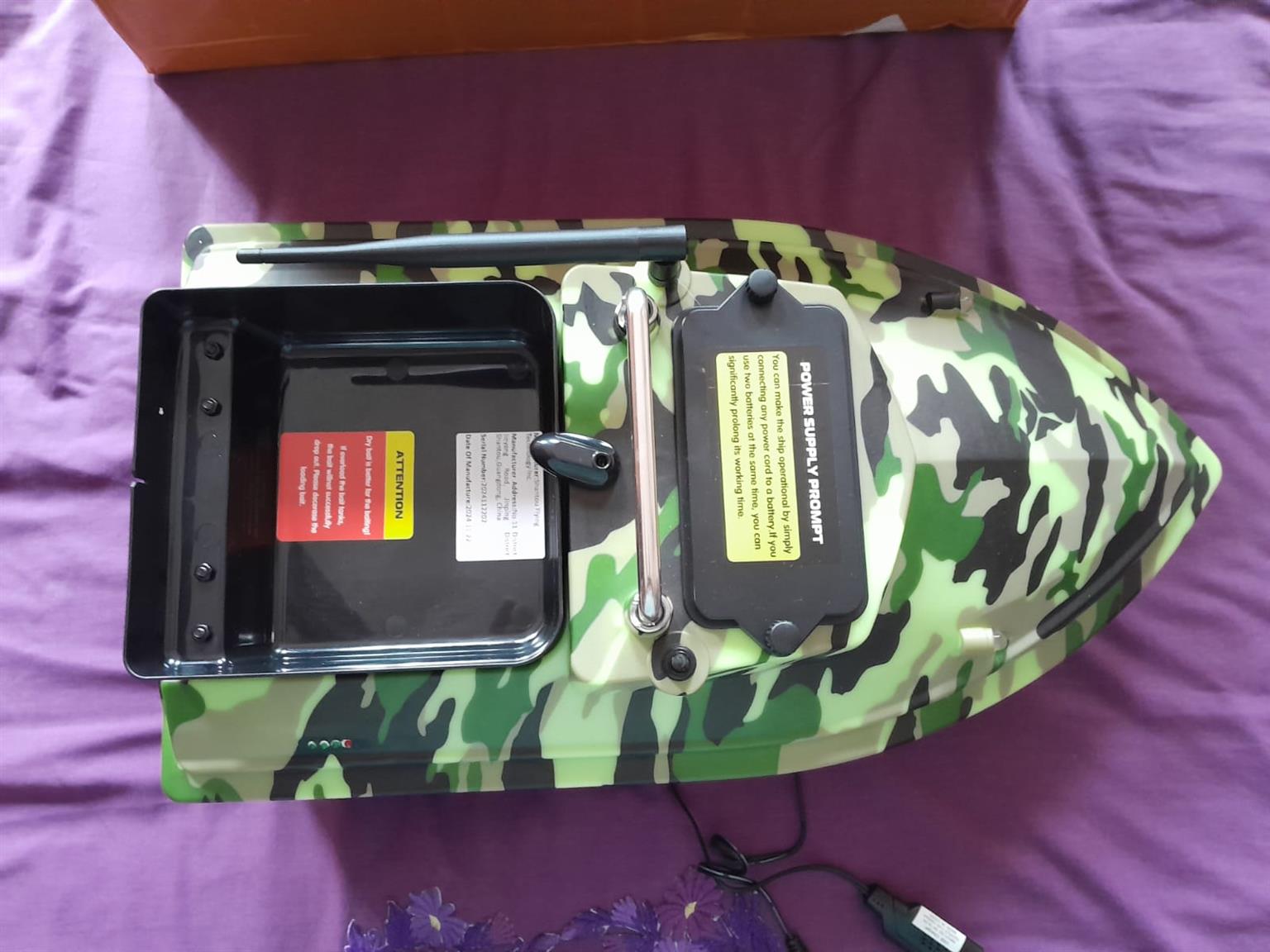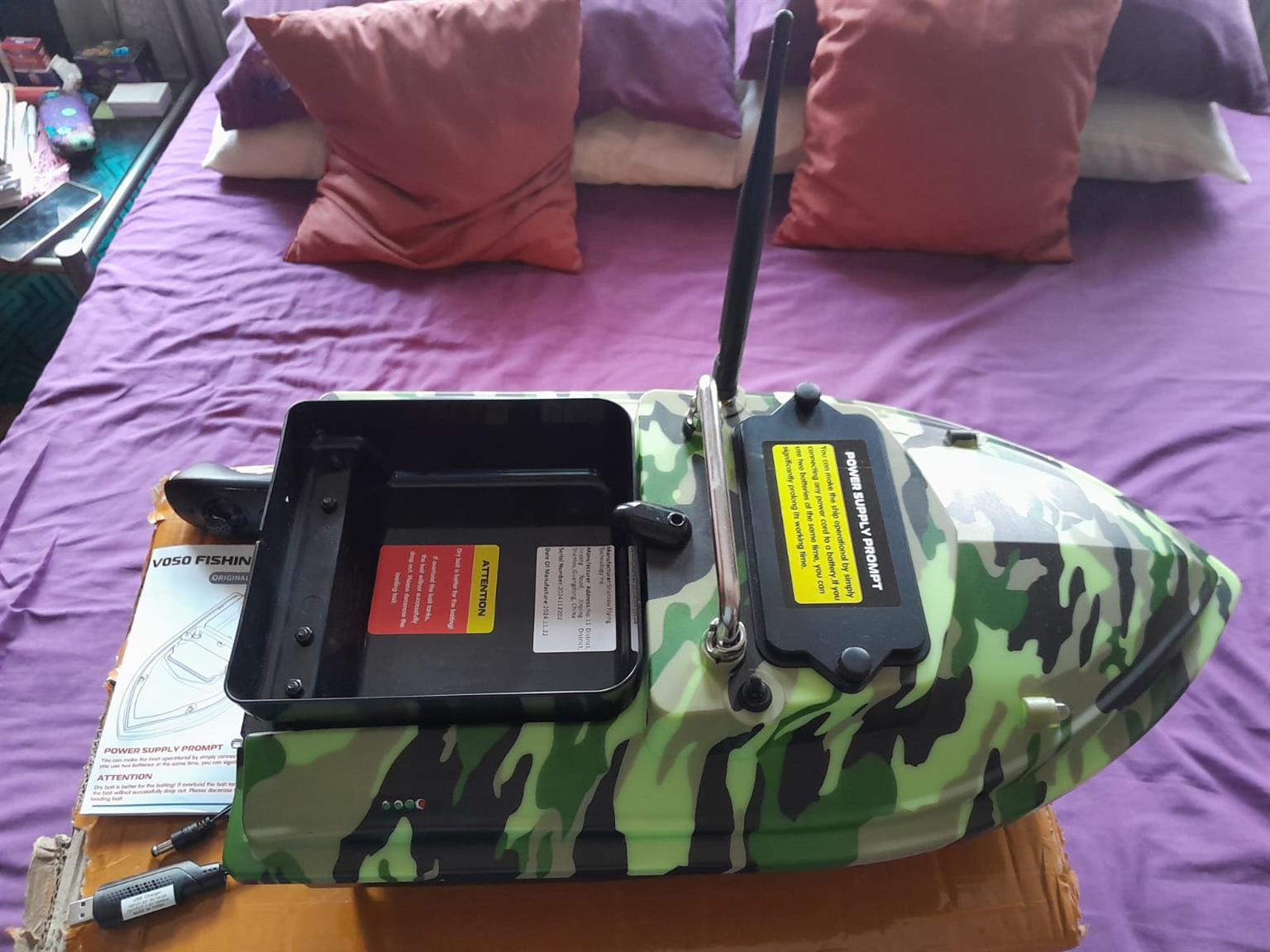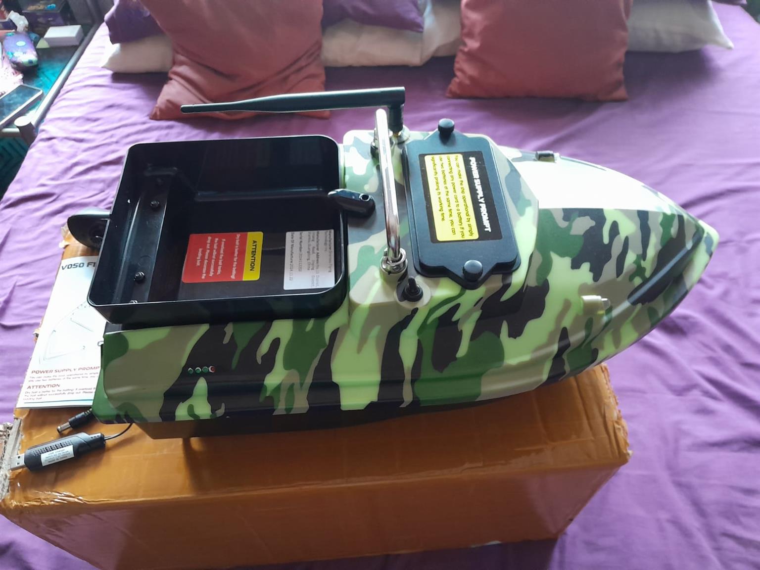 RC Bait boat, 500m max distance, twin motors, very powerfull, wind and wave friendly, light for night fishinf, single sili with 2,5 kb loading capacity, recharcable lithuim battery with usb charger. Item is brand new.