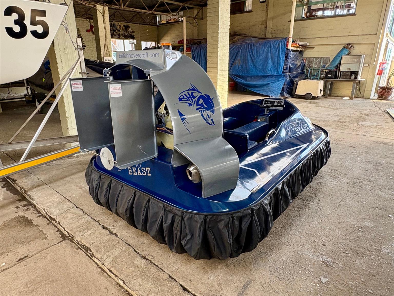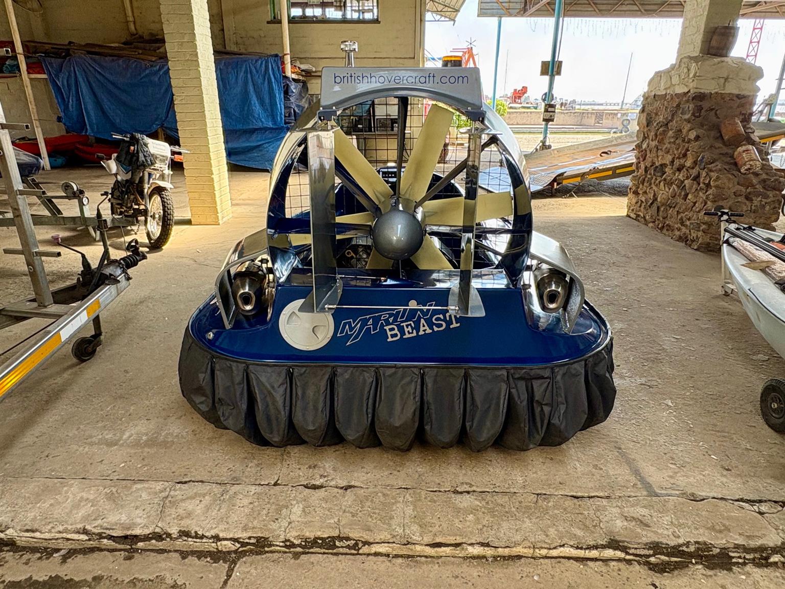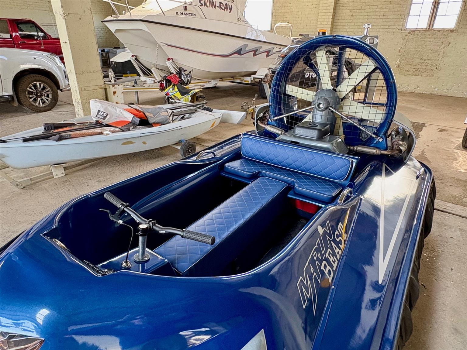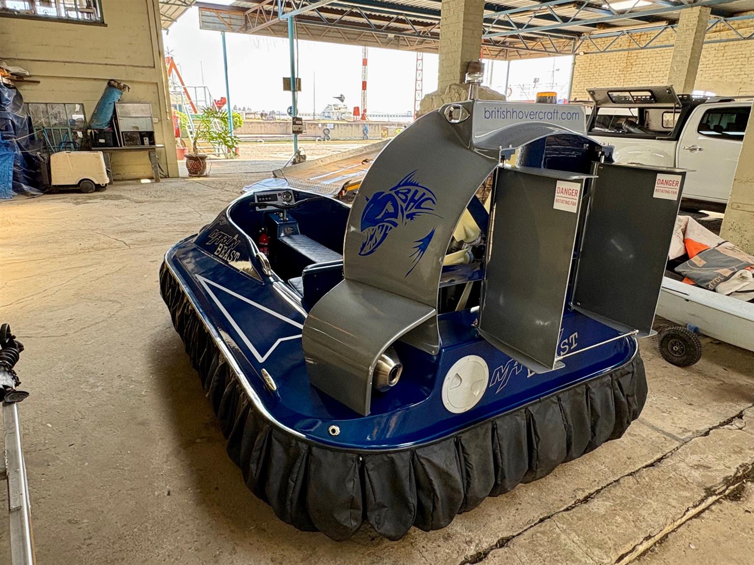 ‘The Beast’ is a stylish sports cruiser hovercraft, praised by Jeremy Clarkson as “the best fun you can have with an engine.” It features a speedometer, improved rudders, colored acrylic dashboard, nonslip flooring, lights, a headlight, and marine-quality fabric seating. Key specifications include: