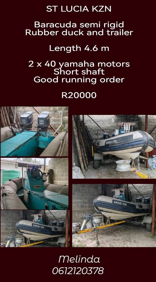 St Lucia Kzn Baracuda semi rigid Rubber duck and trailer Length 4.6 m 2 x 40 yamaha motors Short shaft Good running order R20000 Melinda 0612120378view more