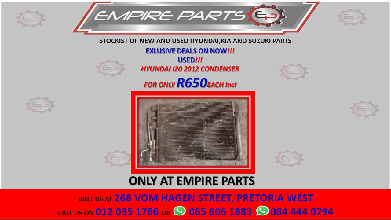 HYUNDAI I20 2012 CONDENSERPrice - R650.00Make - HyundaiCondition - UsedContact Empire Parts for more information.