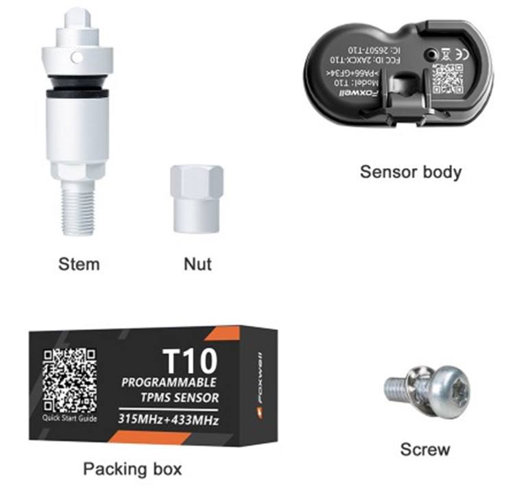 T10 Universal Programmable TPMS Sensor T10 is an universal programmable TPMS sensor developed by Foxwell in 2020. It integrates 315MHz and 433MHz dual frequency and can replace more than 99% of the direct tire pressure system OEM sensors on the market today. With Foxwell TPMS service tools, itcan be easily activated and programmed within seconds.