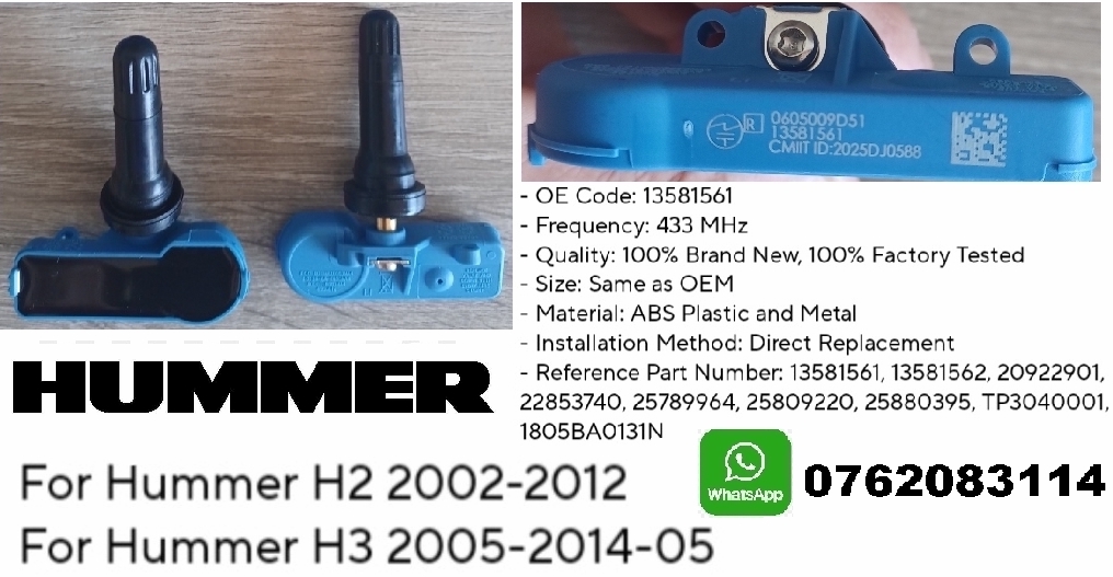 Hummer TPMS / tyre pressure monitor sensors and replacement valve stems. This Shrader sensor has the OEM part numbers 13581561, 25789964, 1805BA0131N, 1805BA0141N-A as well as other equivalent numbers These are sensors that are used on the H2 ( 2002 - 12 ) and H3 ( 2005 - 14 ) models.