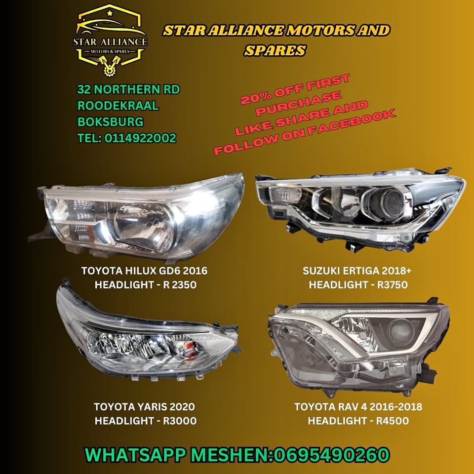 HEADLIGHT SPECIAL TOYOTA HILUX GD6 2016 HEADLIGHT - R2350 SUZUKI ERTIGA 2018+ - R3750 TOYOTA YARIS 2020 - R3000 TOYOTA RAV 4 2016-18 - R4500 PLEASE WHATSAPP MESHEN 0*6*9*5*4*9*0*2*6*0 0114922002view more 32 NORTHERN RD, ROODEKRAAL, BOKSBURG The largest scrapyard in the East rand Over 50 makes of vehicles Over 500 cars stripping for spares STAR ALLIANCE MOTORS & SPARES