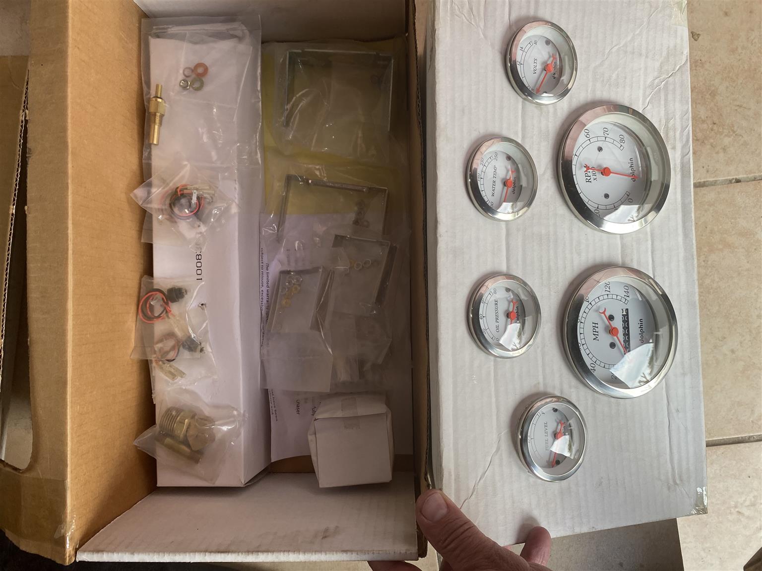 Gauges Dolphin universal classic 6pc gauge set Chrome Bezels hot rod street vintage GM, Chev, Chevy, Chevrolet, Camaro, Ford, Dodge BRAND NEW with all fittings & sensors fuel, speeds, rev counter (Tacho) Volt, oil pressure water temperature 85mm & 52 mm as per pictures.