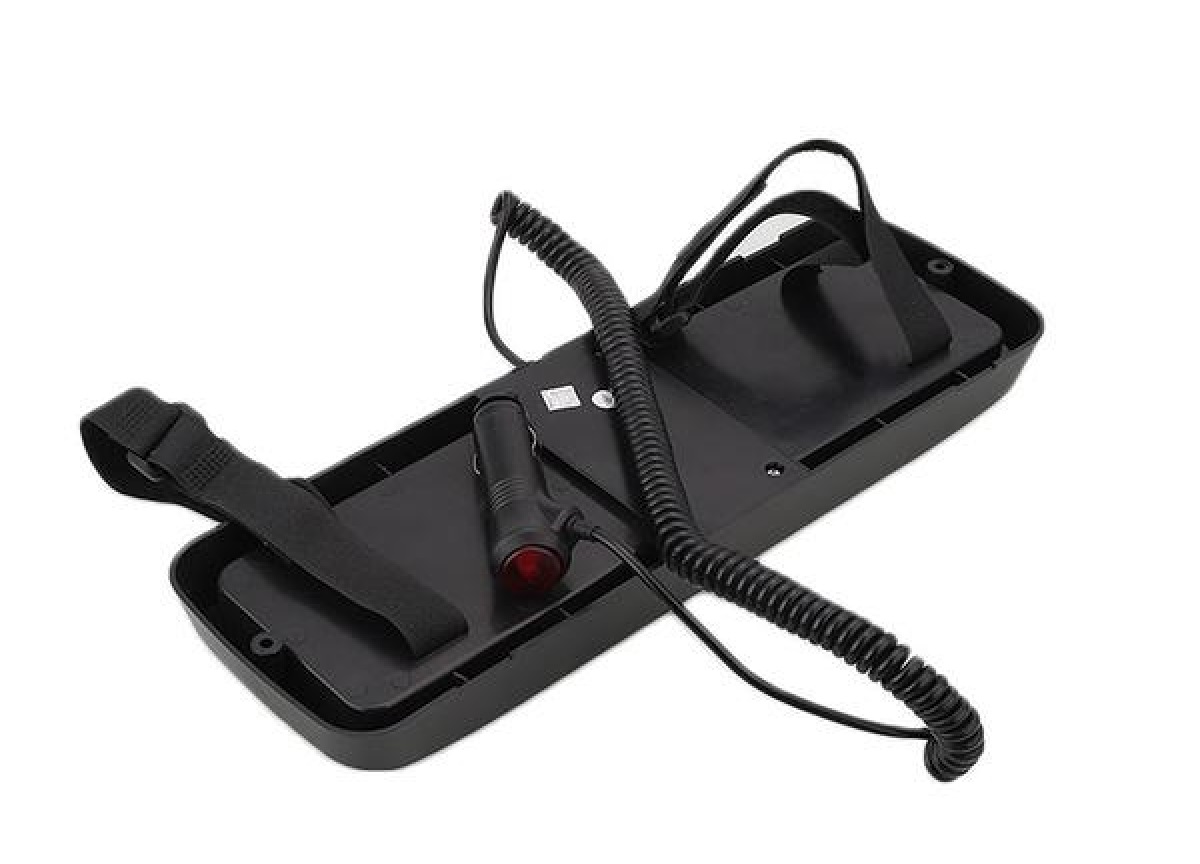 Includes a heavy-duty straight power wire with a cigarette lighter plug and visor attachment straps at the back.