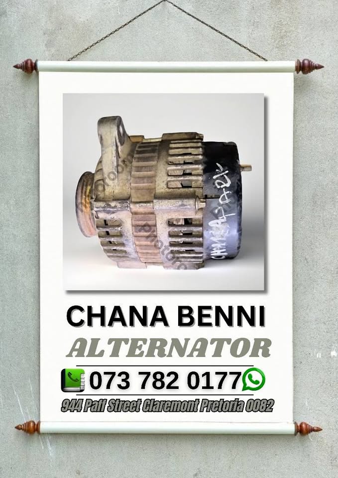 Chana benni alternator We sell spares for most car models Engine parts available We are a second hand spares shop BC AUTO WORKSHOP : ZERO SEVEN THREE SEVEN EIGHT TWO ZERO ONE SEVEN SEVEN 944 PAFF ST CLAREMONT PRETORIA 0082