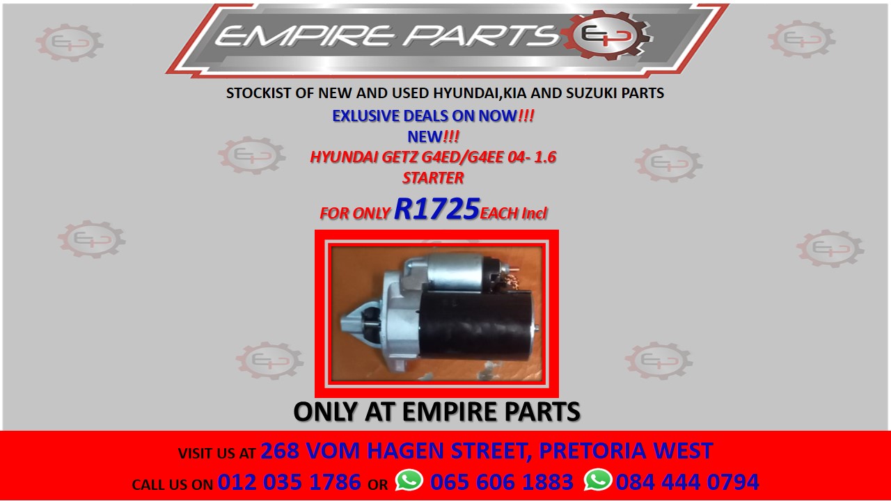 HYUNDAI GETZ G4ED/G4EE 04- 1.6 STARTERPrice - R1725.00Make - HyundaiCondition - NewContact Empire Parts for more information.