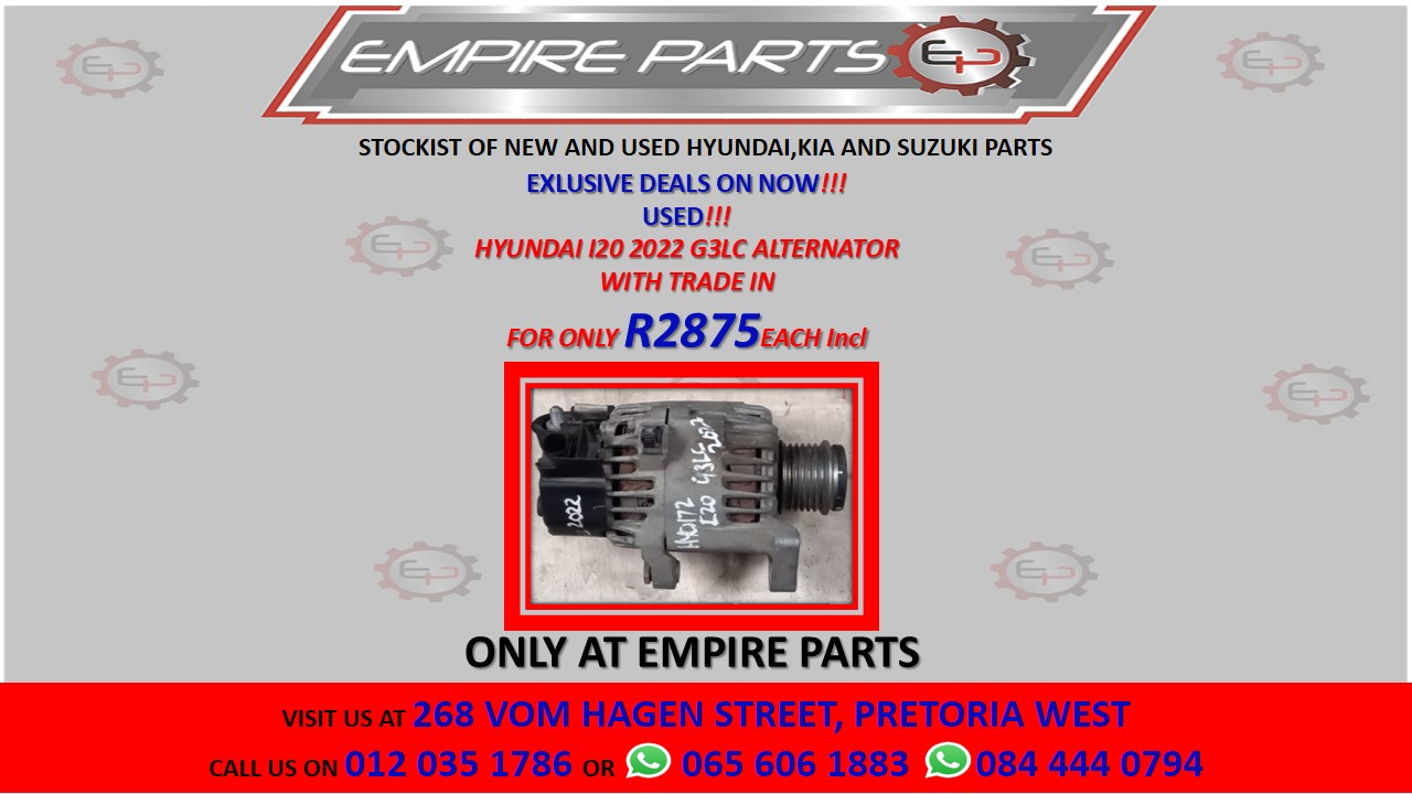 HYUNDAI I20 2022 G3LC ALTERNATOR WITH TRADE INPrice - R2875.00Make - HyundaiCondition - UsedContact Empire Parts for more information.