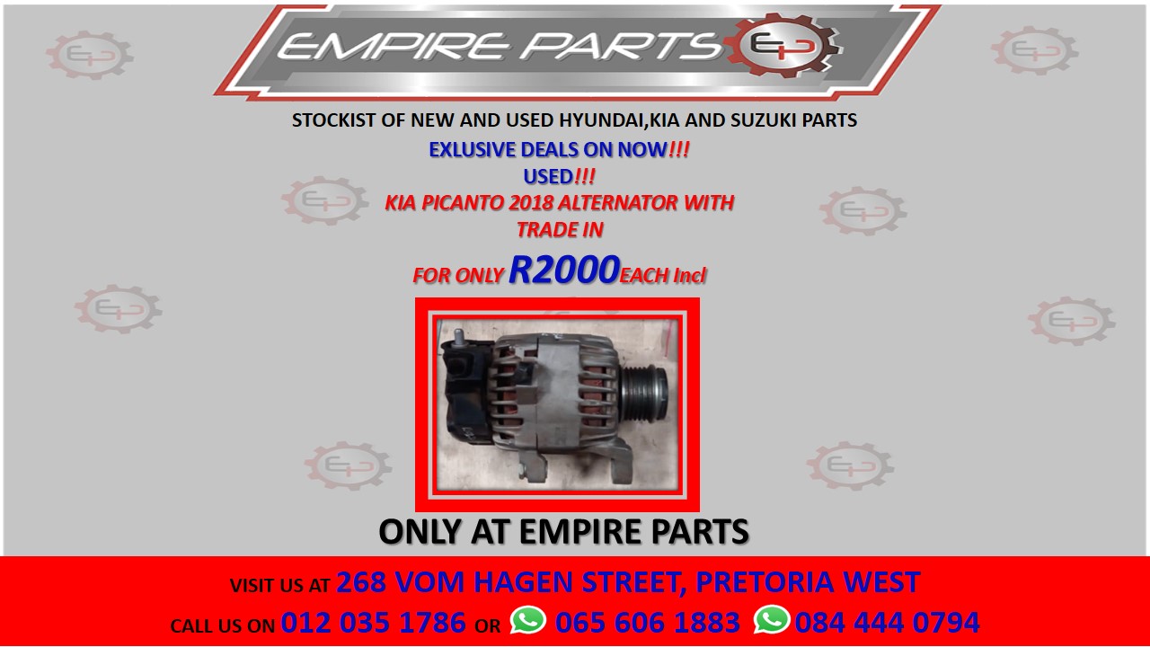 KIA PICANTO 2018 ALTERNATOR WITH TRADE INPrice - R2000.00Make - KiaCondition - UsedContact Empire Parts for more information.