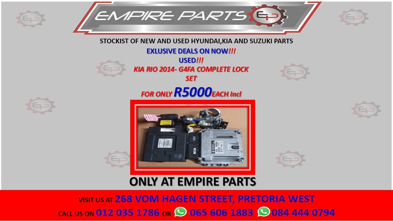 KIA RIO 2014- G4FA COMPLETE LOCK SETPrice - R5000.00Make - KiaCondition - UsedContact Empire Parts for more information.