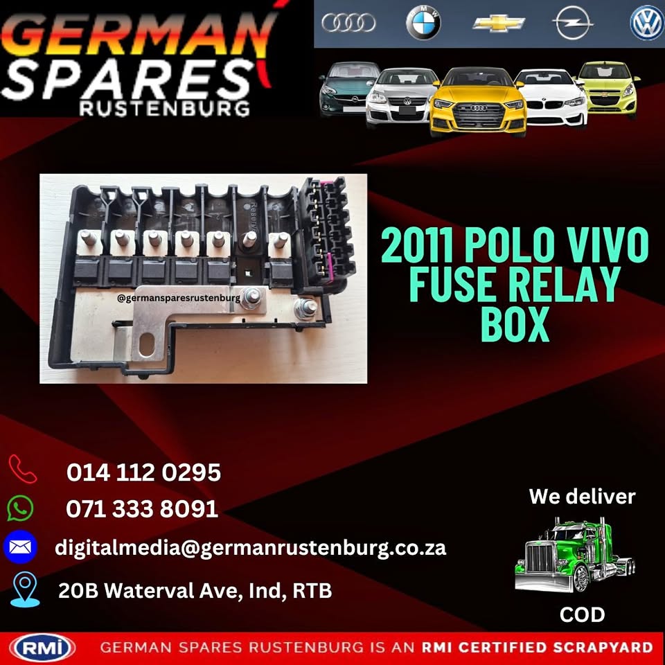 2011 Polo Vivo Fuse Relay Box For Sale. (NEW) Contact Hein on Landline : Email : German Spares Rustenburg 20 Waterval Avenue Industrial - Rustenburg www.germansparesrustenburg.co.za We specialize in new & used Bmw, Audi, Vw, Chev, Opel & Ford Parts & Spares