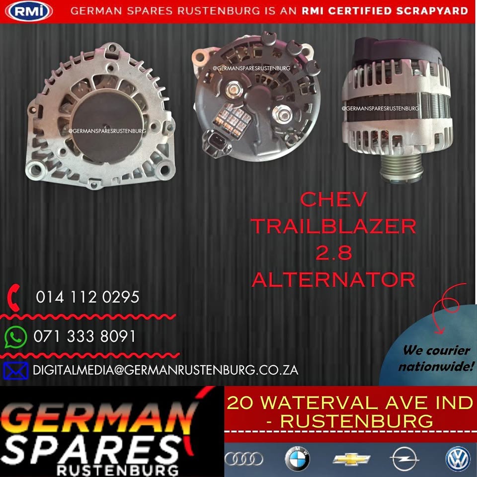 Chev Trailblazer 2.8 Alternator For Sale. (NEW) Contact Hein on Landline : Email : German Spares Rustenburg 20 Waterval Avenue Industrial - Rustenburg www.germansparesrustenburg.co.za We specialize in new & used Bmw, Audi, Vw, Chev, Opel & Ford Parts & Spares