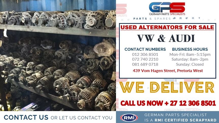 USED REPLACEMENT VW & AUDI ALTERNATORS FOR SALE GERMAN PARTS SPECIALIST • Second-hand used quality spares • Audi & VW Volkswagen vehicles for stripping / breaking for spare parts • New aftermarket quality parts • Parts store / Automotive scrapyard • RMI certified scrapyard • We deliver (Gauteng surrounding areas) CASH ON DELIVERY AVAILABLE • Courier nation wide • We will buy your damage or running vehicle Business hours Mon-Fri: 8am–5:15pm Saturday: 8am–2pm Sunday: Closed Contact numbers- Landline: 012 306 8501view more https://wa.me/+27727402210view more 439 Vom Hagen Street, Pretoria West.