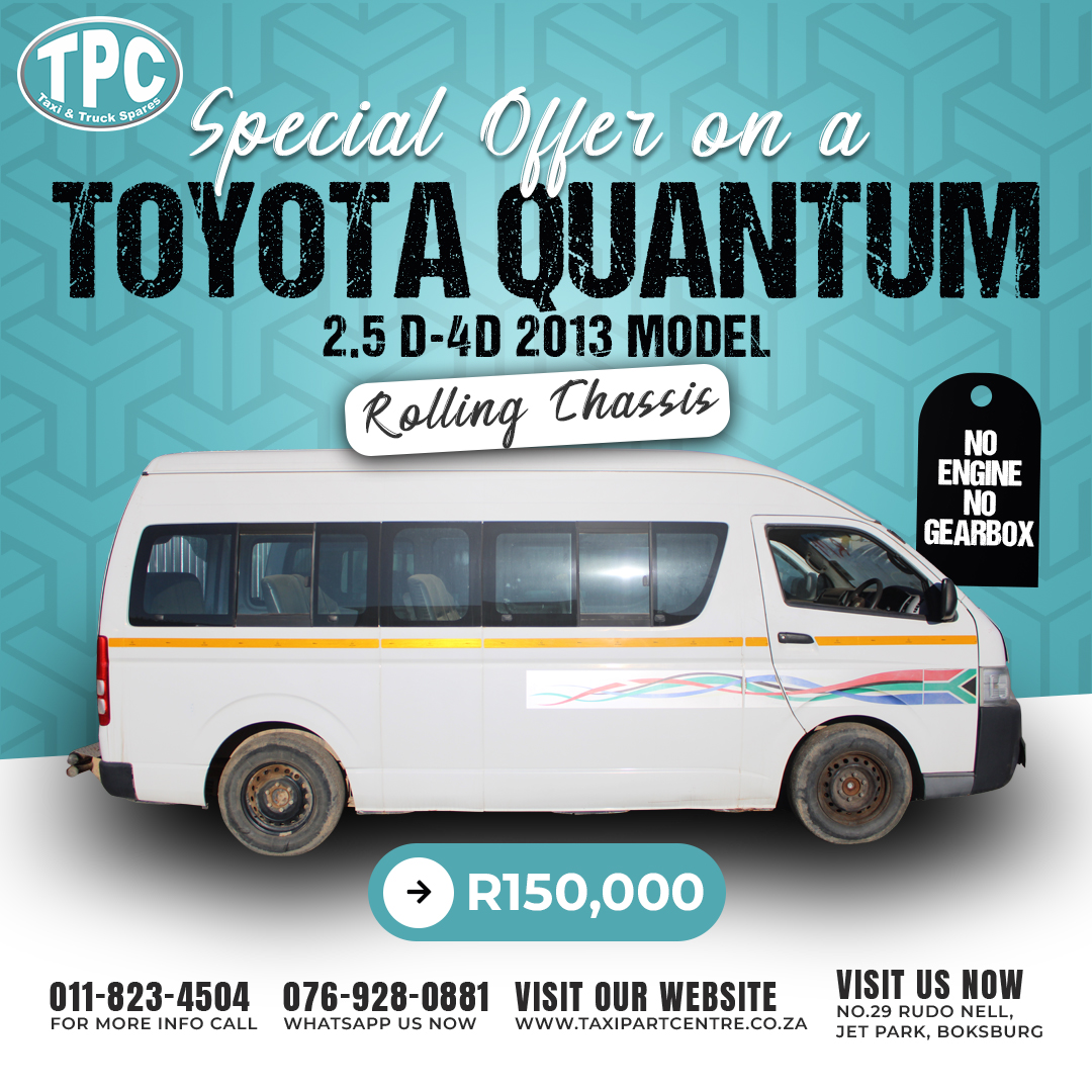 Special offer on our Rolling Chassis of a Toyota Quantum 2.5 D-4D 2013 Model. Note; No Engine and No Gearbox. Get it now before stock runs out.
