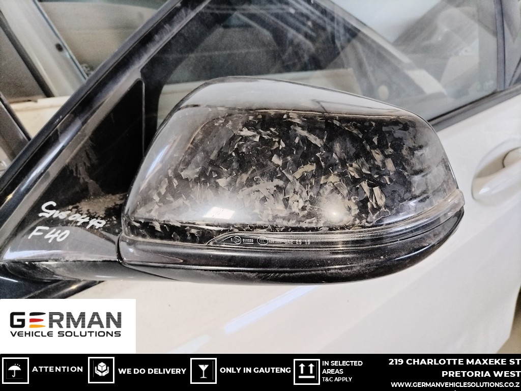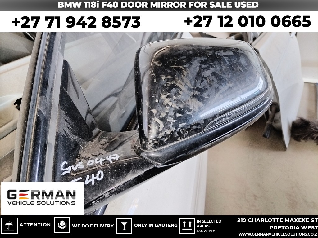 This is a genuine, used right-side mirror for the BMW 118i F40 model. It includes the mirror housing, glass, and electrics. Ideal if your mirror has been cracked or damaged in a tight parking space, this replacement ensures your vehicle remains safe and stylish. Trust original BMW engineering when replacing vital parts.