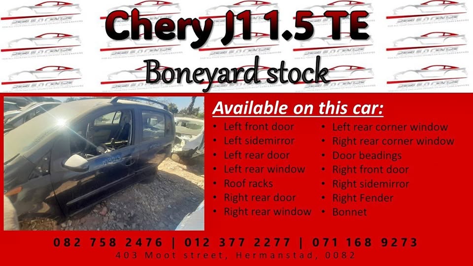 Rebuild Centre Chery J1 1.5 TE stripping for spares. Contact us today for Quality ORIGINAL secondhand spare parts for your car. -Landline - Admin - Langman. or come and give us a visit at 403 Moot street, Hermanstad