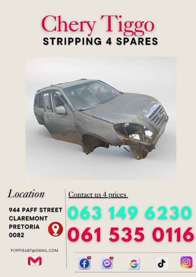 Chery tiggo stripping for spares Contact BGK Auto Spares for pricing and detailed information ZERO SIX THREE ONE FOUR NINE SIX TWO THREE ZERO 944 PAFF ST CLAREMONT PRETORIA 0082