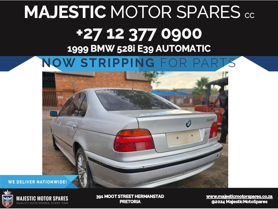 stripping a 1999 bmw 528i e39 automatic for spares. available parts include suspension components, body panels, lights, interior trim, dashboard, seats, mirrors, wheels, and more. all parts are inspected and in good condition. perfect for e39 repairs or upgrades. nationwide courier service available. contact us for pricing and availability.