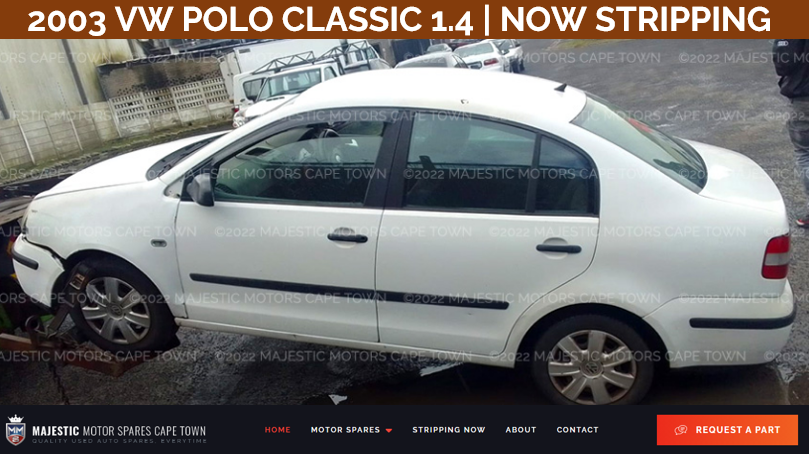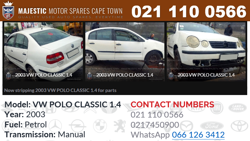 NOW STRIPPING FOR SPARES & PARTS- VW POLO CLASSIC 1.4 2003Model: VW POLO CLASSIC 1.4 Year: 2003Fuel: PetrolTransmission: MANUAL