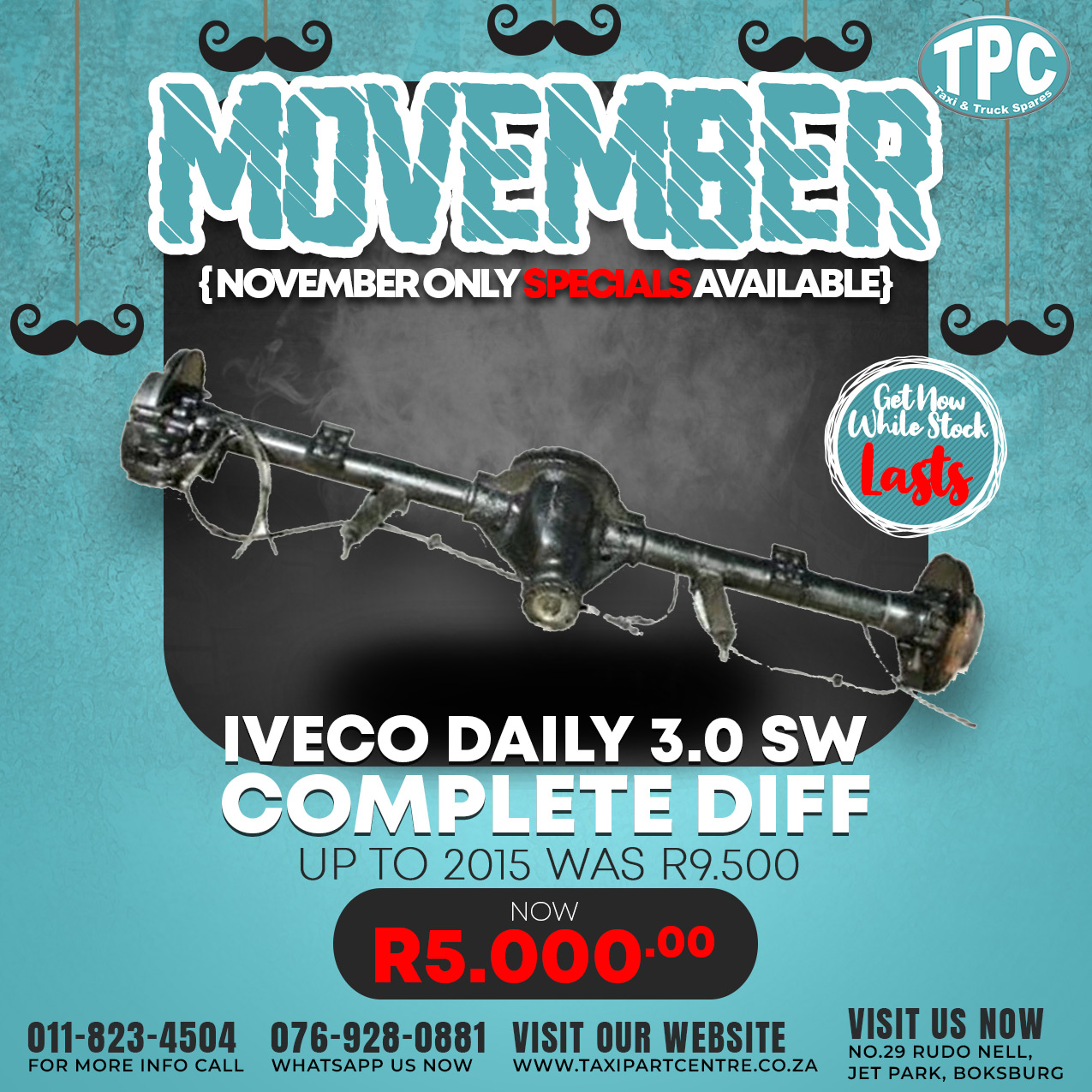 Celebrate Movember with us with out November only Specials like this Iveco Daily 3.0 SW Complete Diff which was R9.500 now going for R5,000. Get it now while stocks last.