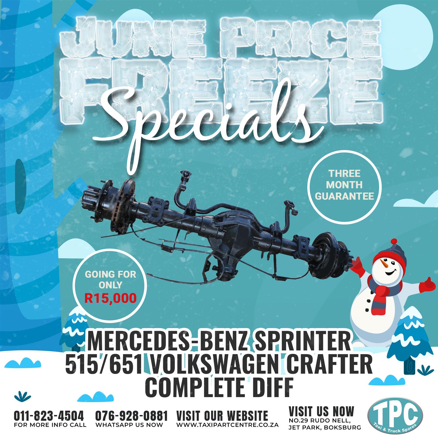 Be ready for our June Price Freeze Special for June only by getting the best parts to get you back on the road like a Mercedes-Benz Sprinter 515/651 Complete Diff going for only R15,000. Get it now while stocks last.