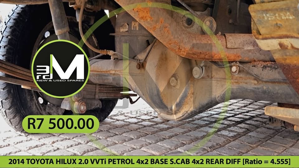 2014 TOYOTA HILUX 2.0 VVTi PETROL 4x2 BASE S.CAB 4x2 REAR DIFF [Ratio = 4.555 Used Front or Rear Differentials come with a 30-Day Guarantee and Warranty, terms & conditions apply. Our Diffs are sold complete and are salvaged from written off vehicles. All our diffs are OEM, Original Equipment Manufacturer. To ensure, we provide you with the correct Front or Rear Differential, specific to your vehicle's specifications, please speak to one of our experienced salesmen, via means provided by the current platform. Alternatively, use the contact details provided below; 0️⃣1️⃣1️⃣ 0️⃣4️⃣4️⃣ 3️⃣3️⃣8️⃣0️⃣ - LANDLINE ☎ - 011 044 3380view more 0️⃣6️⃣3️⃣ 5️⃣0️⃣4️⃣ 8️⃣8️⃣4️⃣1️⃣ - CHARLES 📱 - 063 504 8841view more 0️⃣6️⃣7️⃣ 1️⃣5️⃣6️⃣ 9️⃣2️⃣7️⃣4️⃣ - HILSON 📱 - 067 156 9274view more 0️⃣8️⃣3️⃣ 7️⃣0️⃣4️⃣ 2️⃣7️⃣7️⃣4️⃣ - BRUNO 📱 - Or, pay us a visit at the 3rd Millennium Yard, our address [∙⋮∙ Plus Code is; Ext 10, 728 Dame St, Rand Leases, Roodepoort, 1709 [∙⋮∙ RVHP+34 || ○ SKU; → MV0698-R.DIFF